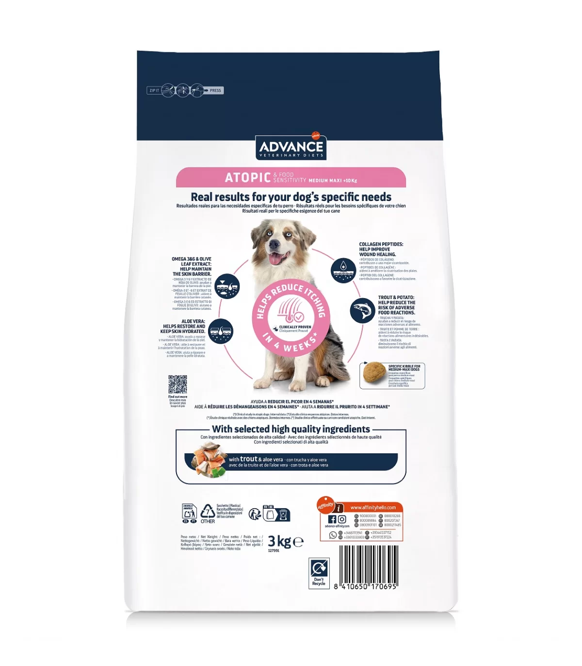 ADVANCE VETERINARY DIETS ATOPIC MEDIUM/MAXI È UN ALIMENTO DIETETICO COMPLETO PER CANI DI TAGLIA MEDIA/MAXI, FORMULATO PER LA CURA DELLA PELLE IN CASO DI DERMATITE ED ECCESSIVA PERDITA DI PELO, OLTRE CHE PER DIMINUIRE LE INTOLLERANZE A INGREDIENTI E NUTRIENTI.