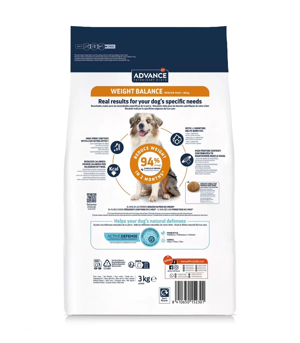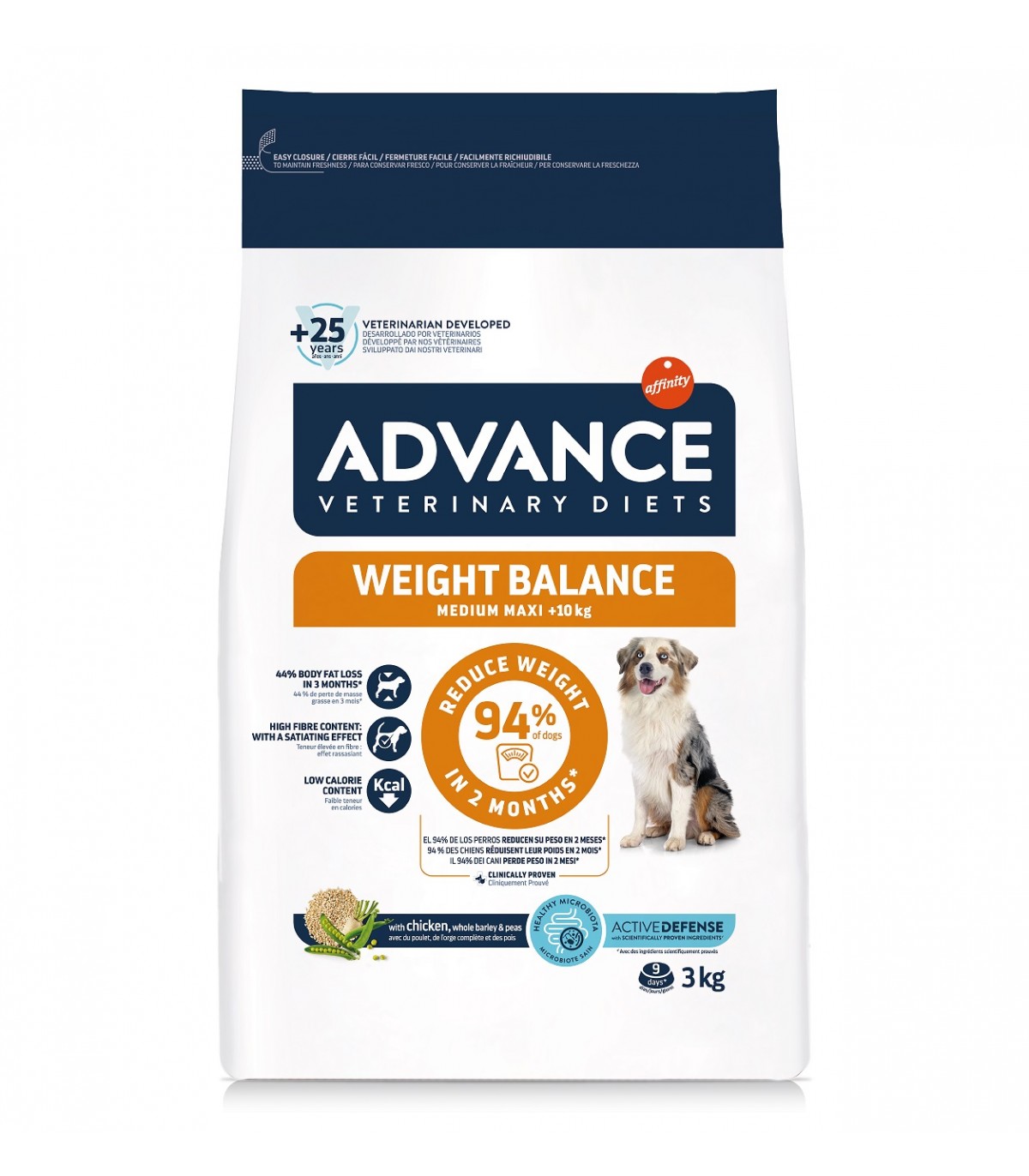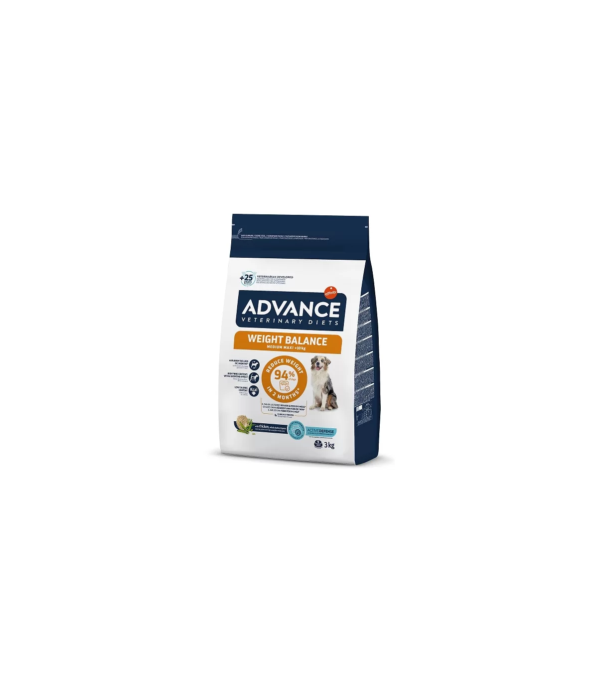 ADVANCE VETERINARY DIETS WEIGHT BALANCE MEDIUM/MAXI È UN ALIMENTO DIETETICO COMPLETO PER CANI ADULTI DI TAGLIA MEDIA/MAXI, FORMULATO PER RIDURRE L’ECCESSO DI PESO E REGOLARE IL METABOLISMO LIPIDICO IN CASO DI IPERLIPIDEMIA, CARATTERIZZATO DA BASSI LIVELLI CALORICI, BASSO CONTENUTO DI GRASSI E ALTO CONTENUTO DI ACIDI GRASSI ESSENZIALI.