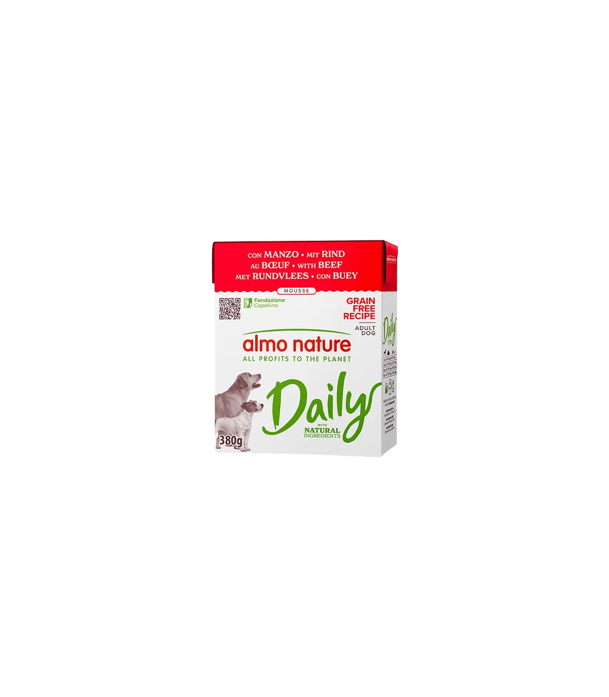 Le ricette Daily sono preparate con ingredienti naturali idonei al pet food: alimenti completi che soddisfano i gusti di tantissimi cani adulti grazie alla varietà di ingredienti(carne, pesce e rigaglie). Con le ricette Daily si ha la certezza di proporre un’alimentazione con la garanzia di qualità Almo Nature, ad un prezzo ancora più conveniente! Tutta la gamma è priva di coloranti o conservanti chimici. La confezione in Tetra Recart® è facile da aprire, comoda da versare ed ha un ridotto impatto climatico rispetto ad altre tipologie di packaging*. Contiene fino al 71% di carta certificata FSC® ed è riciclabile: se smaltita correttamente, può essere riutilizzata come materia prima per altri imballi. Daily – ricette grain free in mousse – è disponibile in confezioni richiudibili da 380 g. Almo Nature è il brand attivista 100% proprietà della Fondazione Capellino. *EuropeIFEULife Cycle Assessment (2020)
