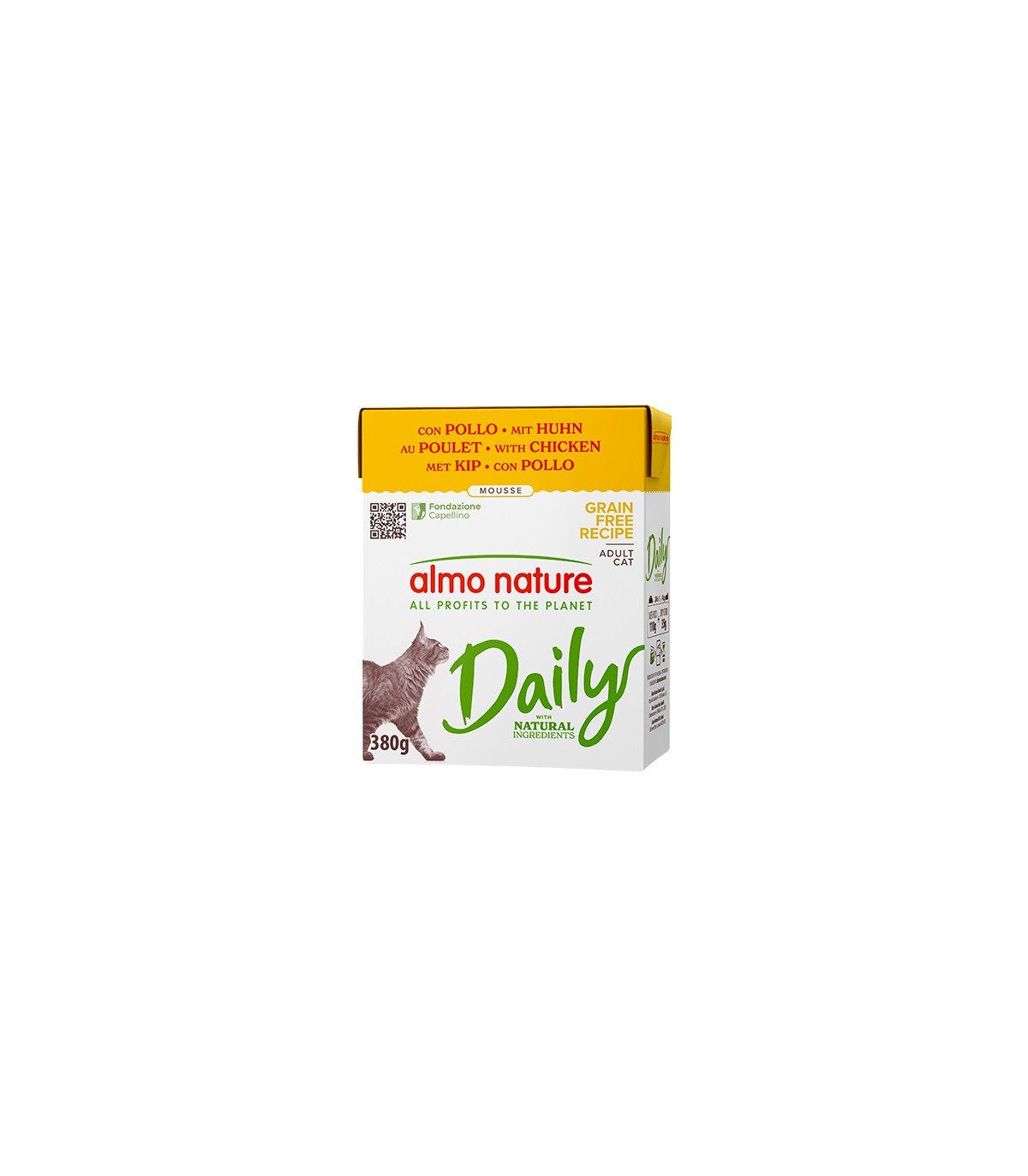 Le ricette Daily sono preparate con ingredienti naturali idonei al pet food: alimenti completi che soddisfano i gusti di tantissimi gatti adulti grazie alla varietà di ingredienti(carne, pesce e rigaglie). Con le ricette Daily si ha la certezza di proporre un’alimentazione con la garanzia di qualità Almo Nature, ad un prezzo ancora più conveniente! Tuttalagamma è priva di coloranti o conservanti chimici. La confezione in Tetra Recart® è facile da aprire, comoda da versare ed ha un ridotto impatto climatico rispettoadaltretipologie di packaging*. Contiene fino al 71% di carta certificata FSC® ed è riciclabile: se smaltita correttamente, può essere riutilizzata come materia prima per altri imballi.Daily – ricette grain free in mousse – è disponibile in comode confezioni monodose da 90 g e confezioni richiudibili da 380 g. Almo Nature è il brand attivista 100% proprietà della Fondazione Capellino.