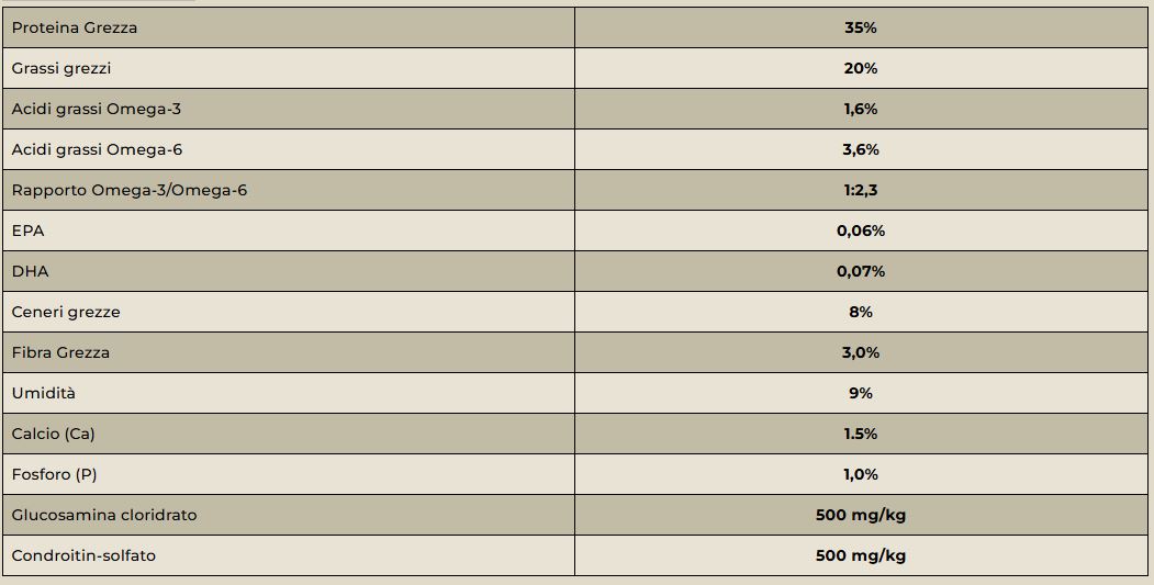 Additivi: Additivi nutrizionali/kg: Vitamina A: 14000 UI, Vitamina D3: 1000 UI, Vitamina E: 100 mg, Taurina: 1000 mg, Ferro (solfato di ferro (II) monoidrato): 50 mg, Iodio (iodato di calcio anidro): 1,5 mg, Rame (solfato di rame (II) pentaidrato): 10 mg, Manganese (solfato manganoso monoidrato): 5 mg, Zinco (solfato di zinco monoidrato): 62,5 mg, Selenio (selenito di sodio): 0,2 mg; Additivi zootecnici: stabilizzatori della flora intestinale 4b1707, Enterococcus faecium: 109 cfu; Additivi tecnologici: Tocoferolo antiossidante estratto da oli vegetali.