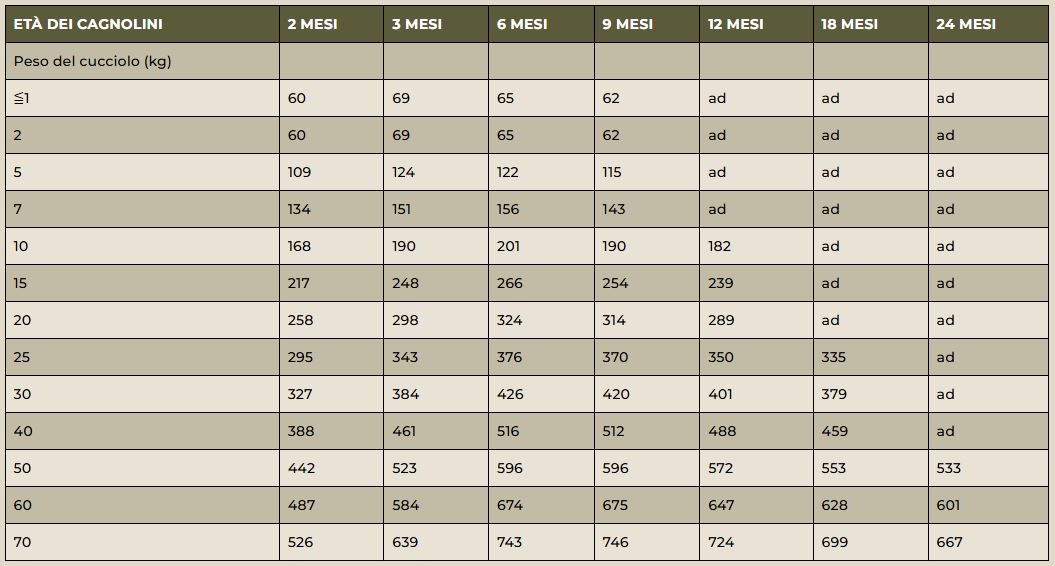 Dopo lo svezzamento fino a 19 settimane, aggiungere il 50% in più della razione giornaliera per kg di peso corporeo; tra le 20 e le 52 settimane invece aggiungere fino al 25% in più della razione giornaliera per kg di peso corporeo.