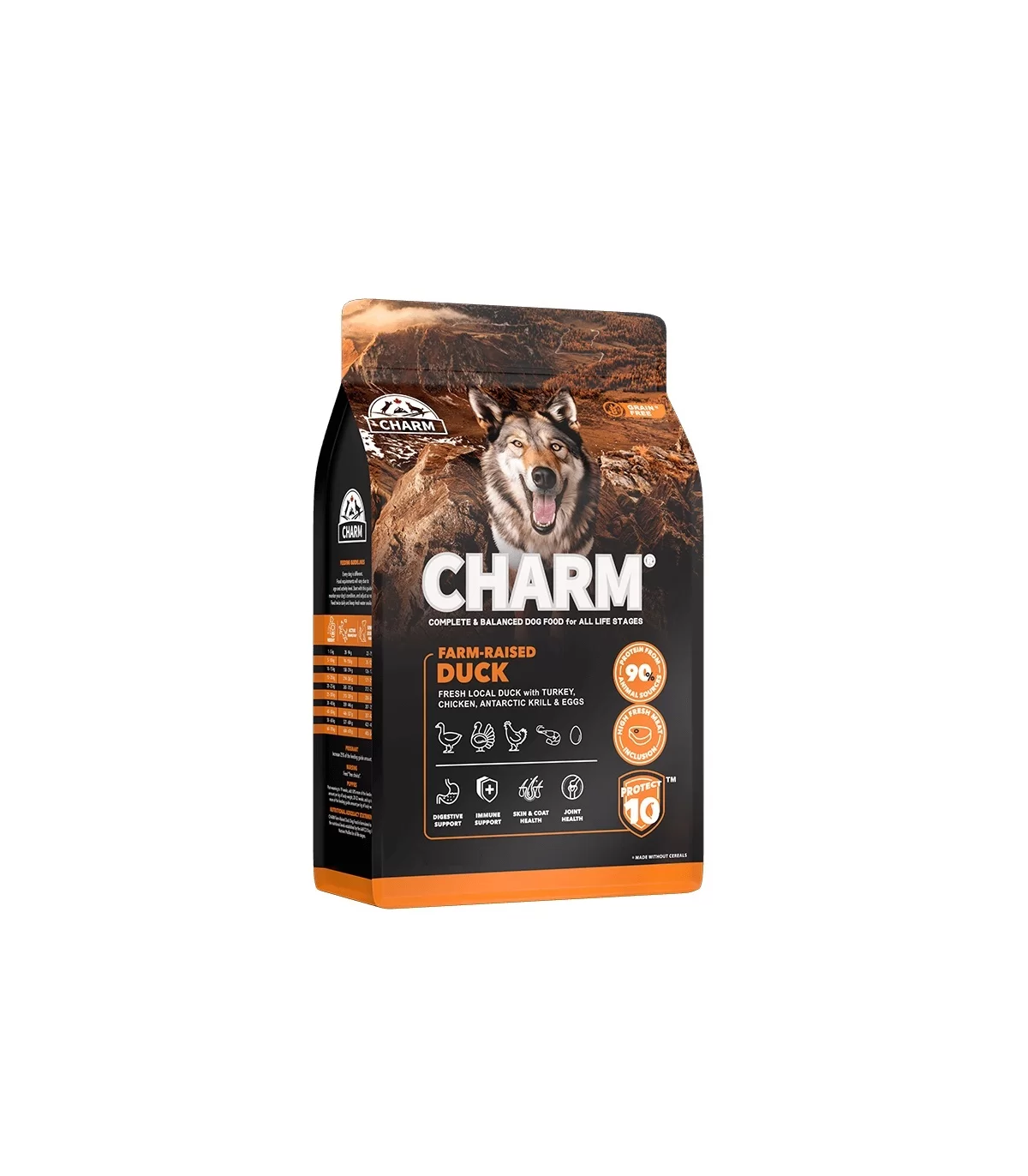 Il cibo per cani CHARM con Anatra allevata in fattoria è formulato per soddisfare i livelli nutrizionali stabiliti dai profili nutrizionali degli alimenti per cani AAFCO per tutte le fasi della vita.