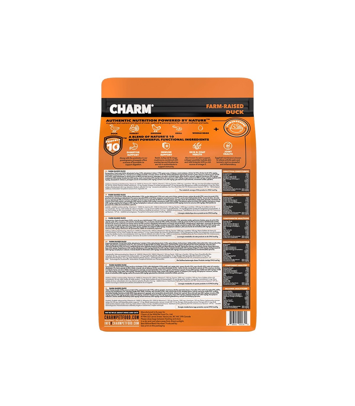 Il cibo per cani CHARM con Anatra allevata in fattoria è formulato per soddisfare i livelli nutrizionali stabiliti dai profili nutrizionali degli alimenti per cani AAFCO per tutte le fasi della vita.