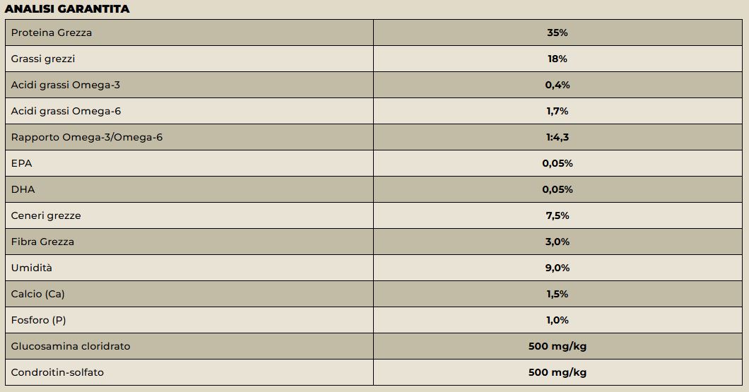 Additivi: Additivi nutrizionali/kg: Vitamina A: 14000 UI, Vitamina D3: 1000 UI, Vitamina E: 100 mg, Taurina: 1000 mg, L-carnitina: 100 mg, Ferro (Ferro (II) solfato monoidrato): 50 mg, Iodio (iodato di calcio anidro): 1,5 mg, Rame (solfato di rame (II) pentaidrato): 10 mg, Manganese (solfato manganoso monoidrato): 5 mg, Zinco (solfato di zinco monoidrato): 62,5 mg, Selenio (sodio selenite): 0,2 mg; Additivi zootecnici: stabilizzatori della flora intestinale 4b1707, Enterococcus faecium: 109 cfu; Additivi tecnologici: Tocoferolo antiossidante estratti da oli vegetali.