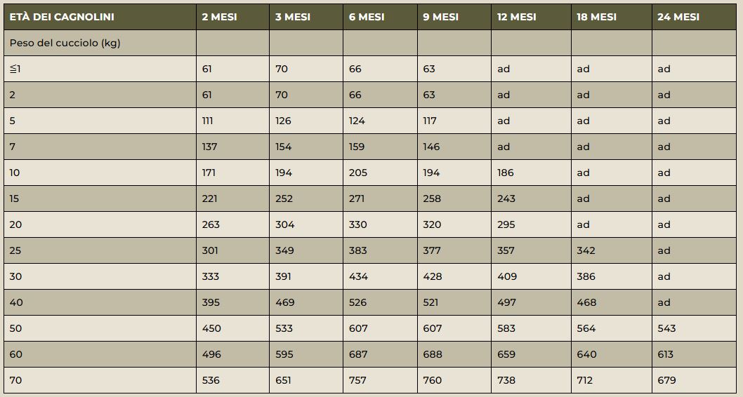 Dopo lo svezzamento fino a 19 settimane, aggiungere il 50% in più della razione giornaliera per kg di peso corporeo; tra le 20 e le 52 settimane invece aggiungere fino al 25% in più della razione giornaliera per kg di peso corporeo.