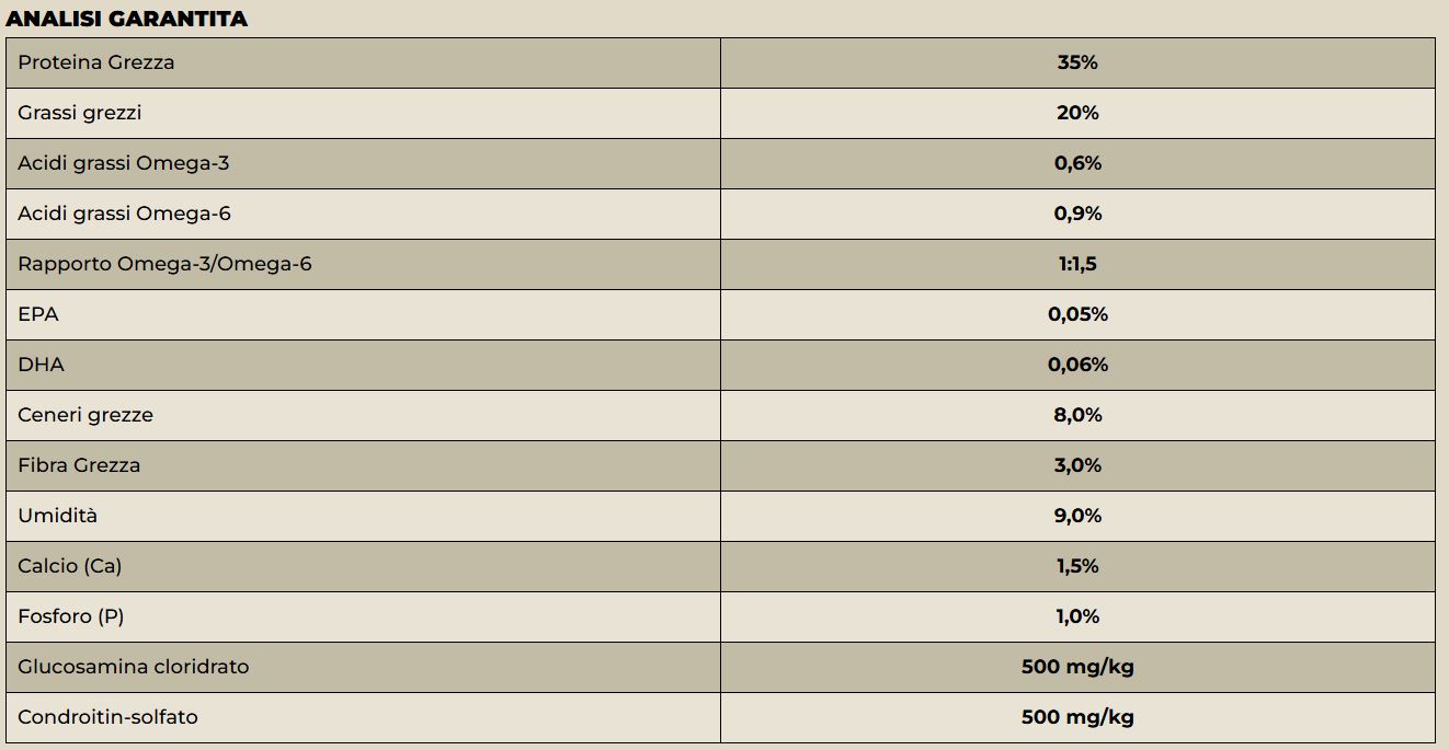 Additivi: Additivi nutrizionali/kg: Vitamina A: 14000 UI, Vitamina D3: 1000 UI, Vitamina E: 100 mg, Taurina: 1000 mg, Ferro (solfato di ferro (II) monoidrato): 50 mg, Iodio (iodato di calcio anidro): 1,5 mg, Rame (solfato di rame (II) pentaidrato): 10 mg, Manganese (solfato manganoso monoidrato): 5 mg, Zinco (solfato di zinco monoidrato): 62,5 mg, Selenio (selenito di sodio): 0,2 mg; Additivi zootecnici: stabilizzatori della flora intestinale 4b1707, Enterococcus faecium: 109 cfu; Additivi tecnologici: Tocoferolo antiossidante estratto da oli vegetali.