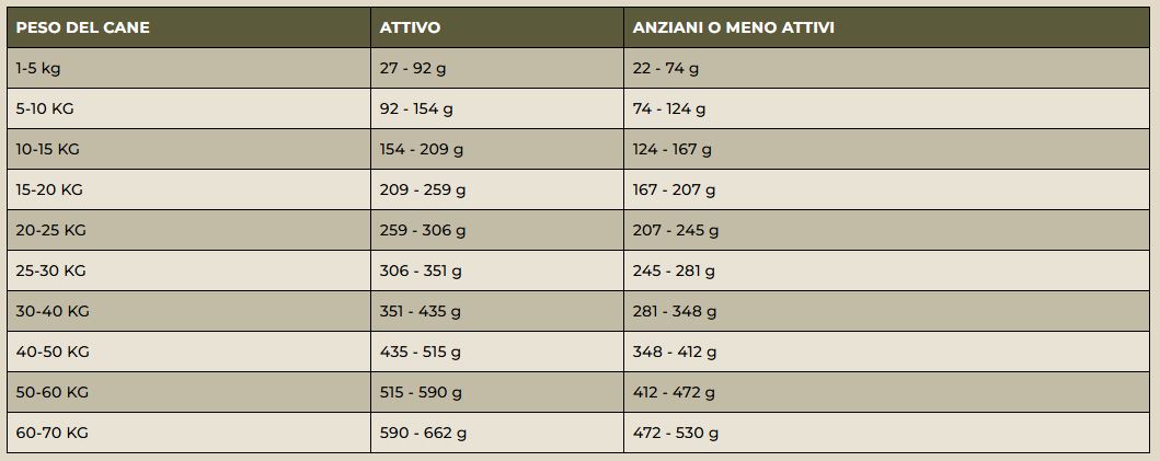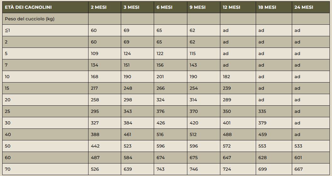 Dopo lo svezzamento fino a 19 settimane, aggiungere il 50% in più della razione giornaliera per kg di peso corporeo; tra le 20 e le 52 settimane invece aggiungere fino al 25% in più della razione giornaliera per kg di peso corporeo.