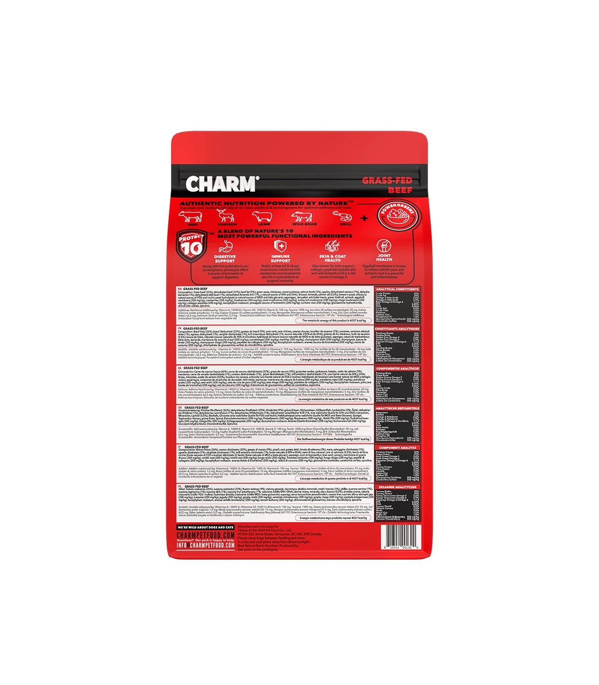 Il cibo per cani CHARM con Manzo allevato ad erba è formulato per soddisfare i livelli nutrizionali stabiliti dai profili nutrizionali degli alimenti per cani AAFCO per tutte le fasi della vita.