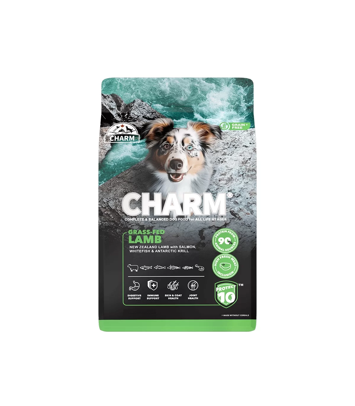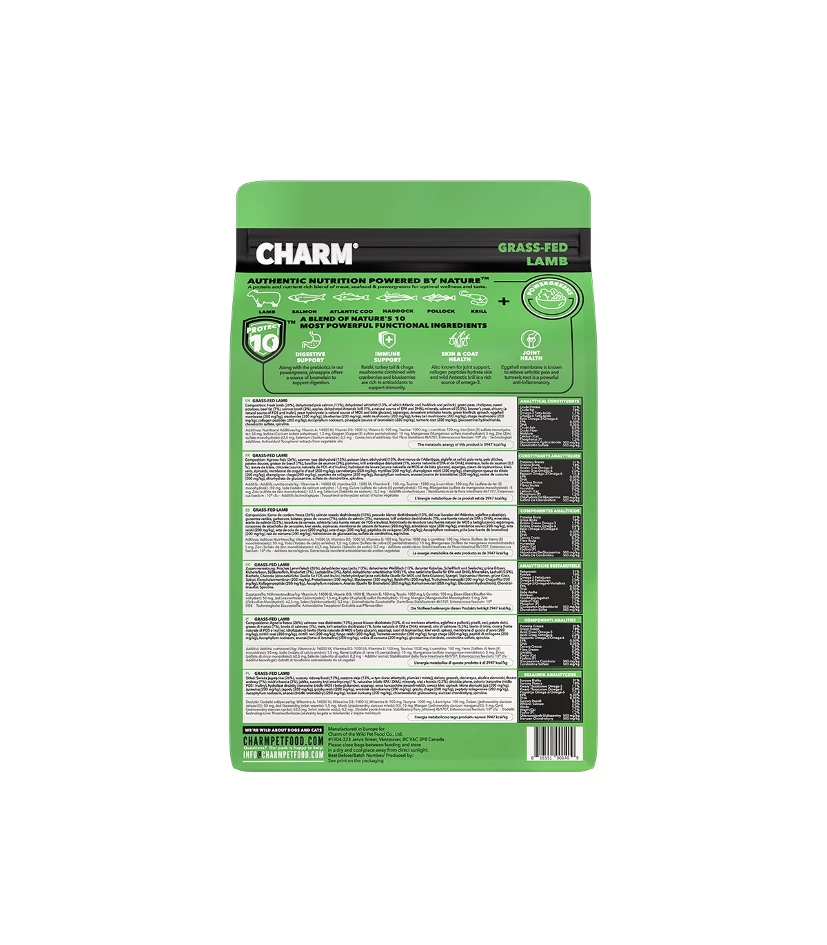 Il cibo per cani CHARM con Agnello allevato ad erba è formulato per soddisfare i livelli nutrizionali stabiliti dai profili nutrizionali degli alimenti per cani AAFCO per tutte le fasi della vita.