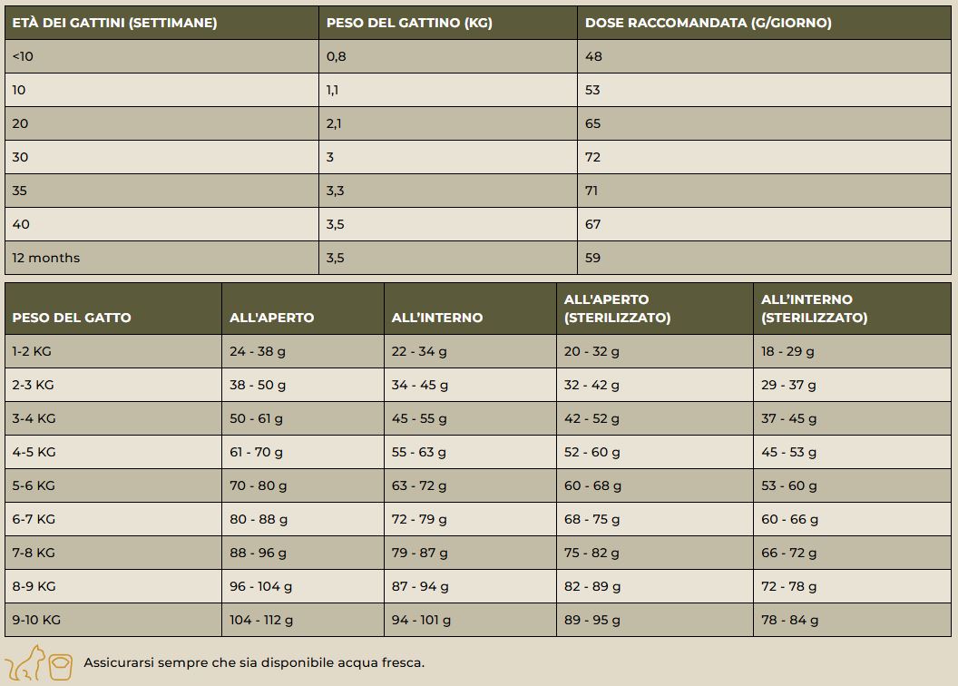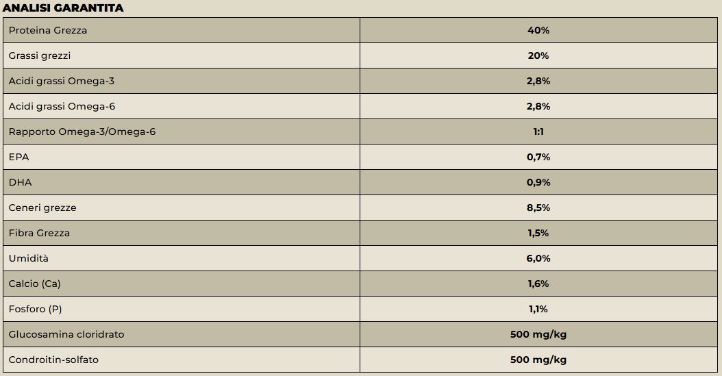 Additivi: Additivi nutrizionali/kg: Vitamina A: 30000 UI, Vitamina E: 150 mg, Taurina: 2000 mg, DL-metionina: 5000 mg, Iodio (iodato di calcio anidro): 1,5 mg, Rame (solfato di rame (II) pentaidrato): 5 mg, Manganese (solfato manganoso monoidrato): 7,5 mg, Zinco (solfato di zinco monoidrato): 50 mg, Selenio (selenito di sodio): 0,2 mg; Additivi zootecnici: stabilizzatori della flora intestinale 4b1707, Enterococcus faecium: 109 cfu; Additivi tecnologici: Tocoferolo estratto da oli vegetali ad azione antiossidante.
