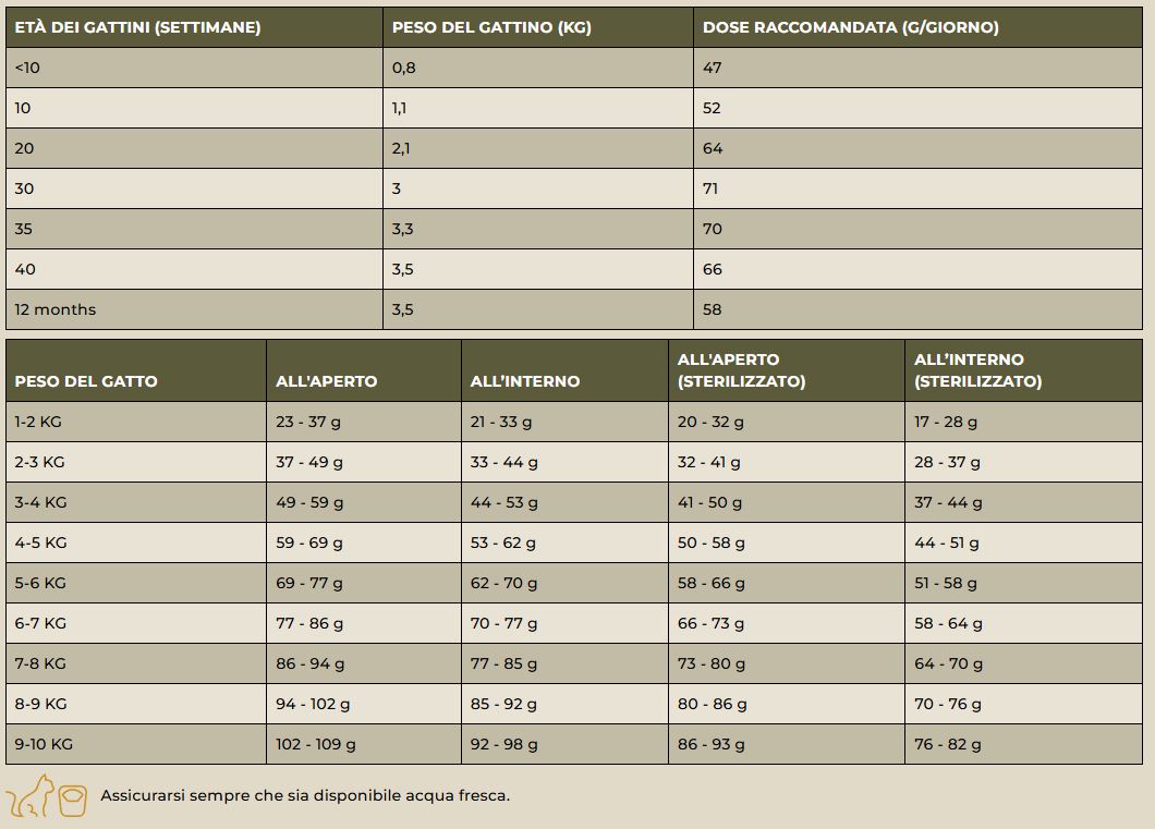 Additivi: Additivi nutrizionali/kg: Vitamina A: 30000 UI, Vitamina D3: 1300 UI, Vitamina E: 150 mg, Taurina: 2000 mg, DL-metionina: 5000 mg, Iodio (iodato di calcio anidro): 1,5 mg, Rame (Solfato di rame (II) pentaidrato): 5 mg, Manganese (solfato manganoso monoidrato): 7,5 mg, Zinco (solfato di zinco monoidrato): 50 mg, Selenio (selenito di sodio): 0,2 mg; Additivi zootecnici: stabilizzatori della flora intestinale 4b1707, Enterococcus faecium: 109 cfu; Additivi tecnologici: Tocoferolo antiossidante estratti da oli vegetali.