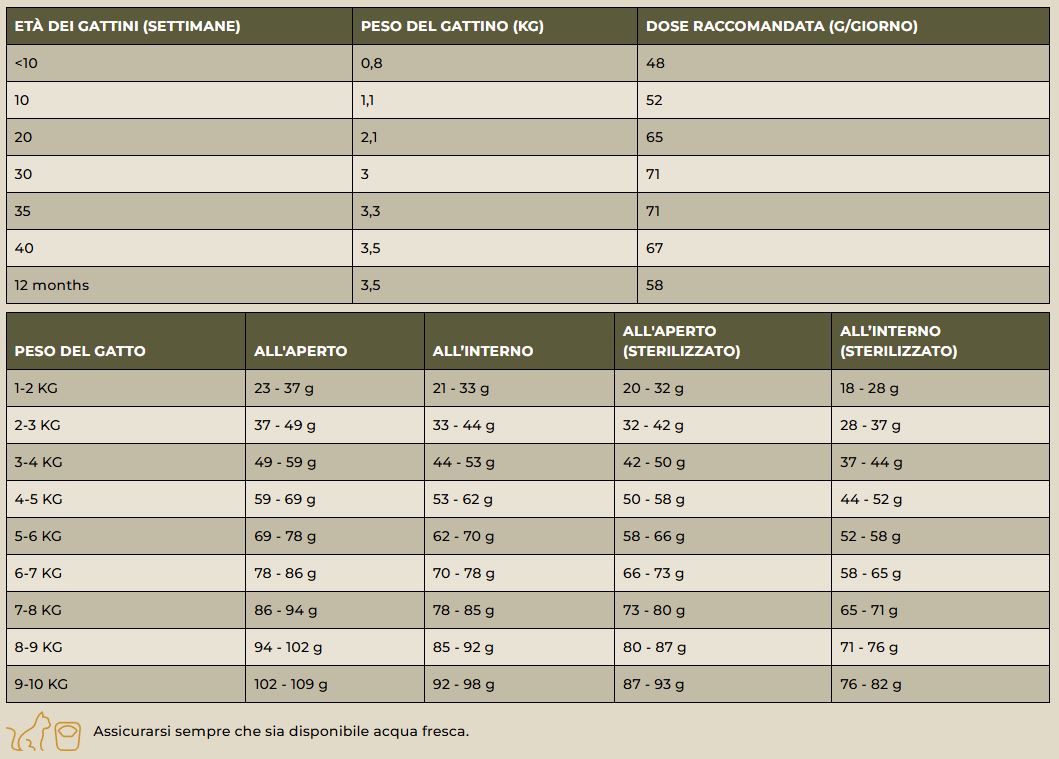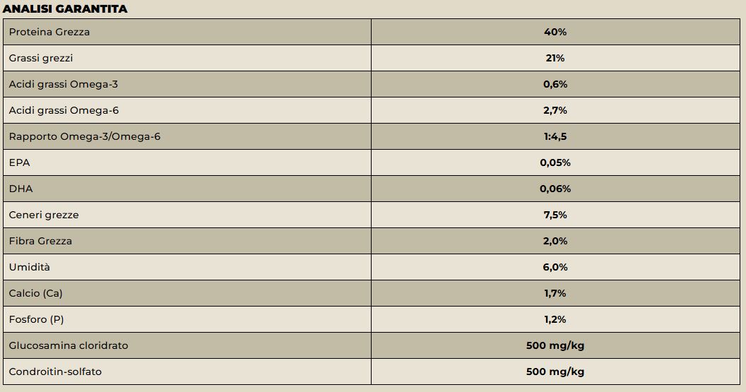 Additivi: Additivi nutrizionali/kg: Vitamina A: 30000 UI, Vitamina D3: 1300 UI, Vitamina E: 150 mg, Taurina: 2000 mg, DL-metionina: 5000 mg, Iodio (iodato di calcio anidro): 1,5 mg, Rame (Solfato di rame (II) pentaidrato): 5 mg, Manganese (solfato manganoso monoidrato): 7,5 mg, Zinco (solfato di zinco monoidrato): 50 mg, Selenio (selenito di sodio): 0,2 mg; Additivi zootecnici: stabilizzatori della flora intestinale 4b1707, Enterococcus faecium: 109 cfu; Additivi tecnologici: Tocoferolo antiossidante estratti da oli vegetali.