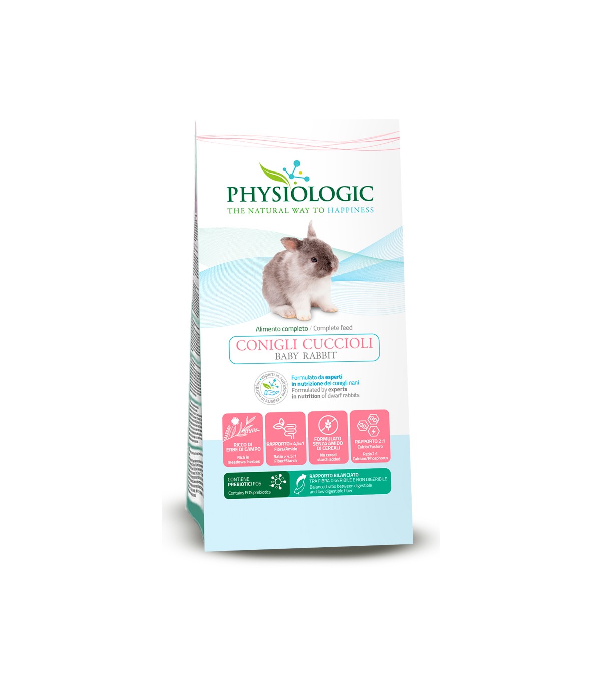 Caratteristiche: PHYSIOLOGIC CONIGLI CUCCIOLI è il mono-alimento composto da ingredienti naturali, studiato da veterinari esperti nell’alimentazione dei conigli nani. Nutrizionalmente bilanciato, è ricco di erbe di campo (naturalmente costituite da oltre 40 tipologie di erbe, fra cui le graminacee come il Fleolo, il Loietto, la Poa, il Bromus, la Festuca, l’erba Marzolina, e tante altre essenze il cui numero e la cui tipologia può variare in base al momento della raccolta). Contiene, inoltre, 10 diverse erbe aromatiche selezionate per il benessere dei conigli nani. L’elevato contenuto di fibre di lunghezze diverse, fino a 3 mm, il corretto apporto di fibra digeribile e non digeribile (Fibra NDF min.31%; Fibra ADF min. 19 %), il corretto rapporto fra le due componenti della fibra (NDF-ADF)/ADF < 1,3),la presenza di prebiotici (F.O.S 2%) ed il basso contenuto di amido (1,7%) favoriscono una buona digestione, la corretta motilità intestinale, la giusta usura dei denti e l’espulsione dei boli di pelo. Non contiene cereali (Grain free e Gluten free), semi, coloranti, aromi artificiali e zuccheri aggiunti. Contiene lievito di birra, noto come fonte naturale di vitamine del gruppo B. Il rapporto Calcio/Fosforo (2:1) ed il rapporto Fibra/amido sono conformi ai più recenti studi sull’alimentazione del coniglio nano. Il ridotto tenore di grassi e di amidi, è utile per il controllo del peso.