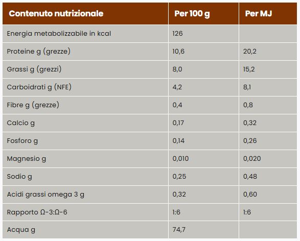 Maiale, pesce, mais, olio di girasole, polvere di uova, minerali, olio di pesce, vitamine e oligoelementi (inclusi gli oligoelementi chelati), solfato di ammonio, cellulosa in polvere, psillio, destrosio, xilosio, cloruro di ammonio, taurina. Non contiene coloranti o aromi artificiali aggiunti.