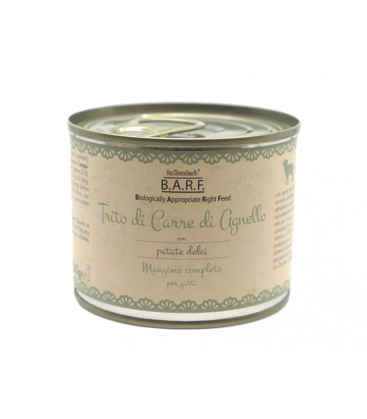 Dr.Clauder’s BARF Alimento completo Trito di Carre di Agnello. BARF sta per Biologically Appropriate Right Feed, con questi prodotti è possibile alimentare in maniera adeguata il tuo animale partendo da una base 100% carne e frattaglie, in modo semplice e veloce. La carne viene stufata lentamente insieme a verdure accuratamente selezionate e oli di elevata qualità; il cibo più naturale per i nostri amici a quattro zampe. A differenza di altri prodotti, i nostri alimenti completi sono arricchiti con oli di qualità, fondamentali per la naturale conservazione delle vitamine. Con la porzione di interiora, il tuo gatto assimilerà una fonte naturale di vitamine, minerali e oligoelementi. Dr.Clauder’s BARF Alimento completo Trito di Carre di Agnello è un insieme perfetto di carne ed interiora 100% da agnello, con patate dolci e oli. Le vitamine e acidi grassi sono forniti dagli oli aggiunti. Solo se il gatto andasse a caccia si alimenterebbe in modo più selvatico rispetto agli alimenti completi B.A.R.F. Dr.Clauder’s. Questo prodotto è adeguato per gatti sensibili, grazie alla sua formula mono proteica. Le specialità Dr.Clauder’s BARF sono puro gusto per il tuo gatto.