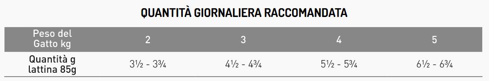 Istruzioni: si raccomanda di richiedere il parere di un veterinario prima dell’uso oppure prima di estendere il periodo d’impiego. Somministrare i quantitativi indicati riportati in tabella in base al peso del gatto, come unica fonte di cibo. Si raccomanda acqua a volontà.