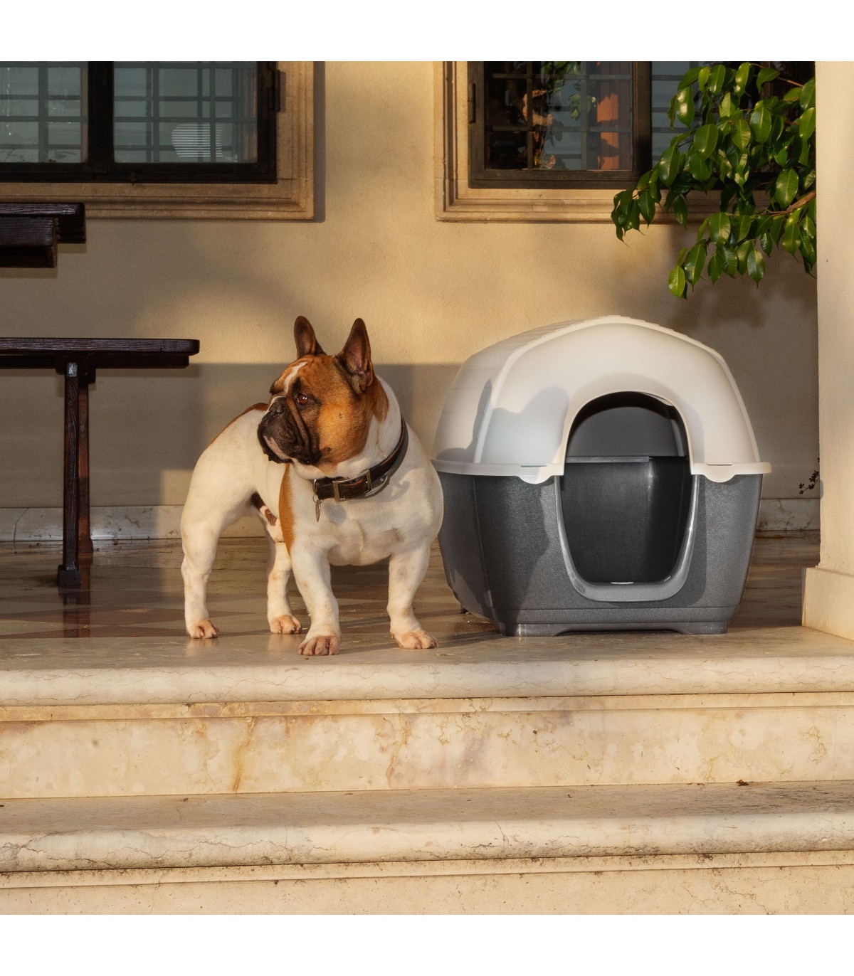 Ricorda nella forma un igloo: Kenny è la cuccia in resina termoplastica per cani, adatta all'esterno, che garantisce un ottimo isolamento sia alle alte che alle basse temperature, è costruita in materiale robusto resistente agli urti e ai raggi UV. La cuccia è dotata dell'utilissimo vent system che assicura la massima ventilazione interna evitando il formarsi di umidità e del sistema drain system che, grazie al fondo con apposite fessure, consente il defluire dell'acqua garantendo così un ambiente sempre asciutto e antisettico. Kenny ha un ampio ingresso per consentire al vostro cane un'entrata agevole e la particolare forma della sua base consente di mantenerla perfettamente isolata da terra.