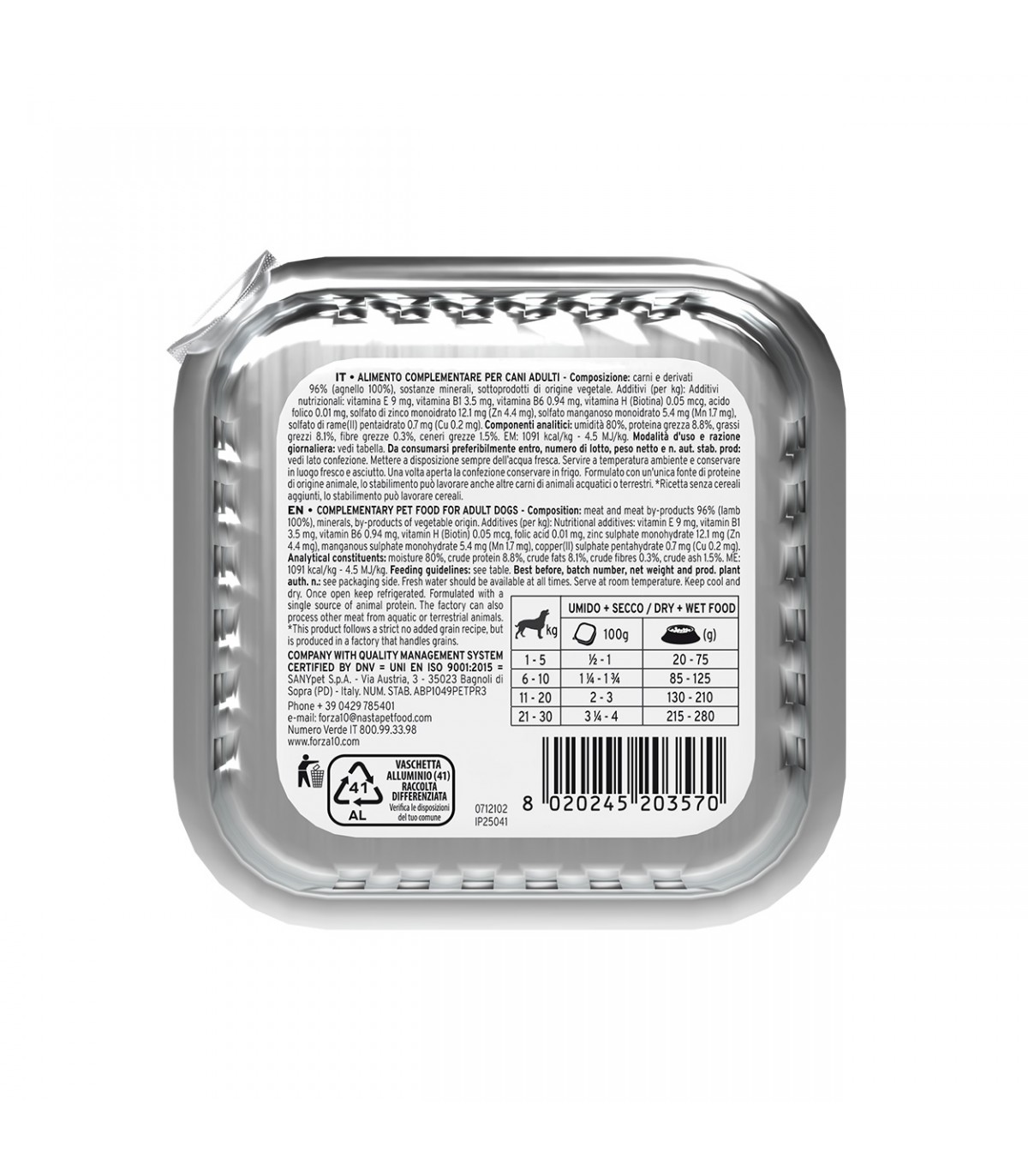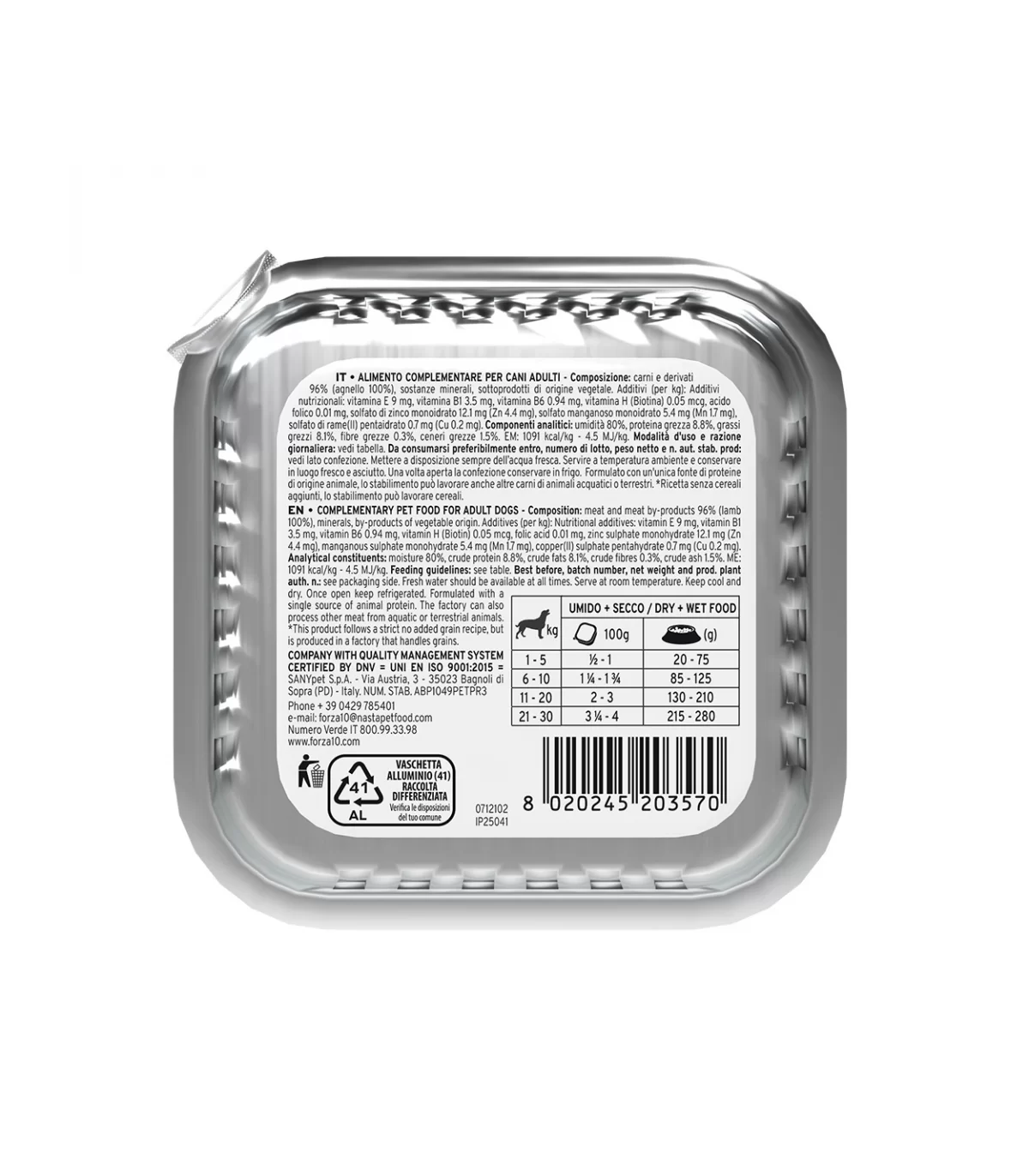 Composizione: carni e derivati 96% (agnello 100%), sostanze minerali, sottoprodotti di origine vegetale.