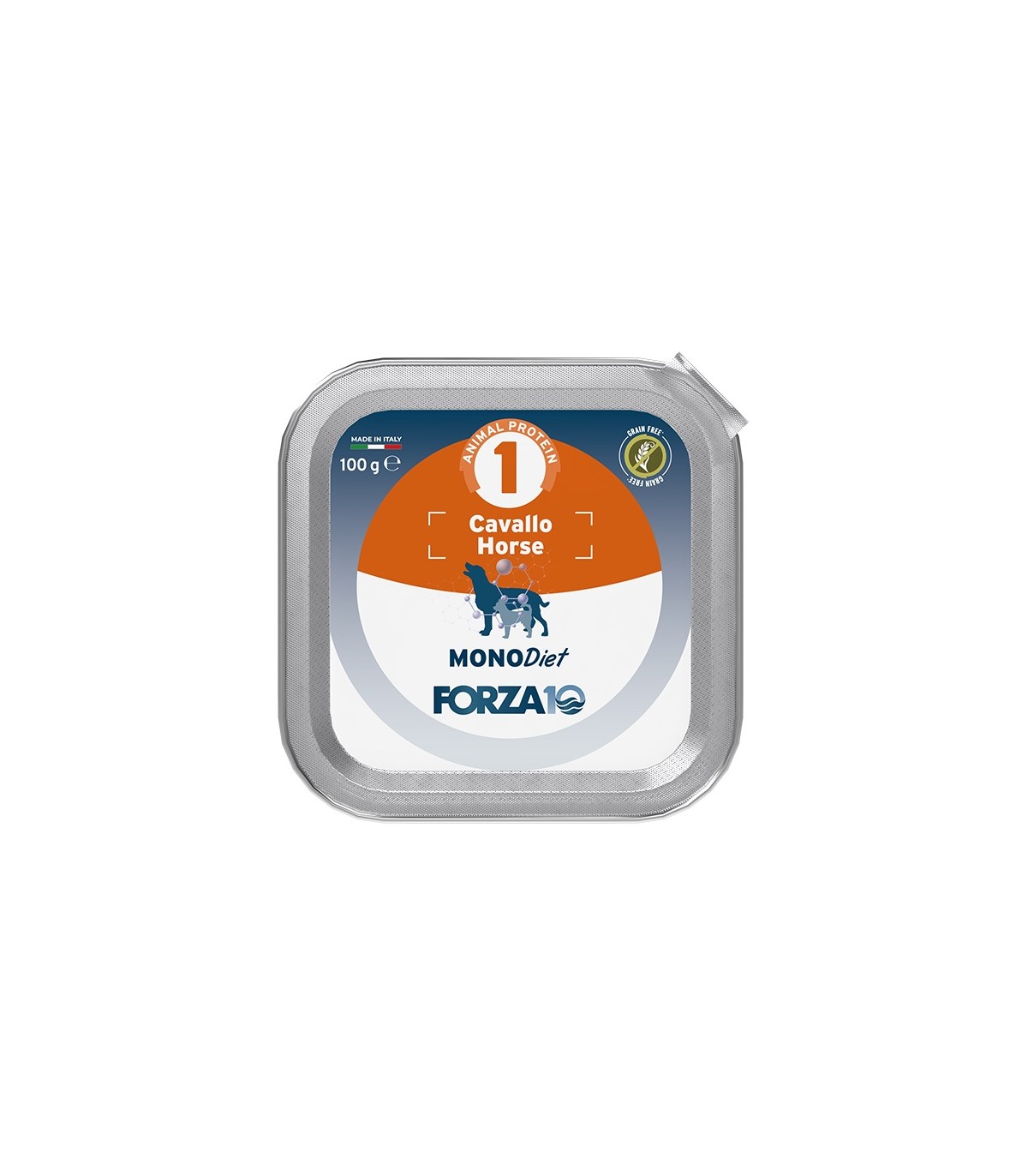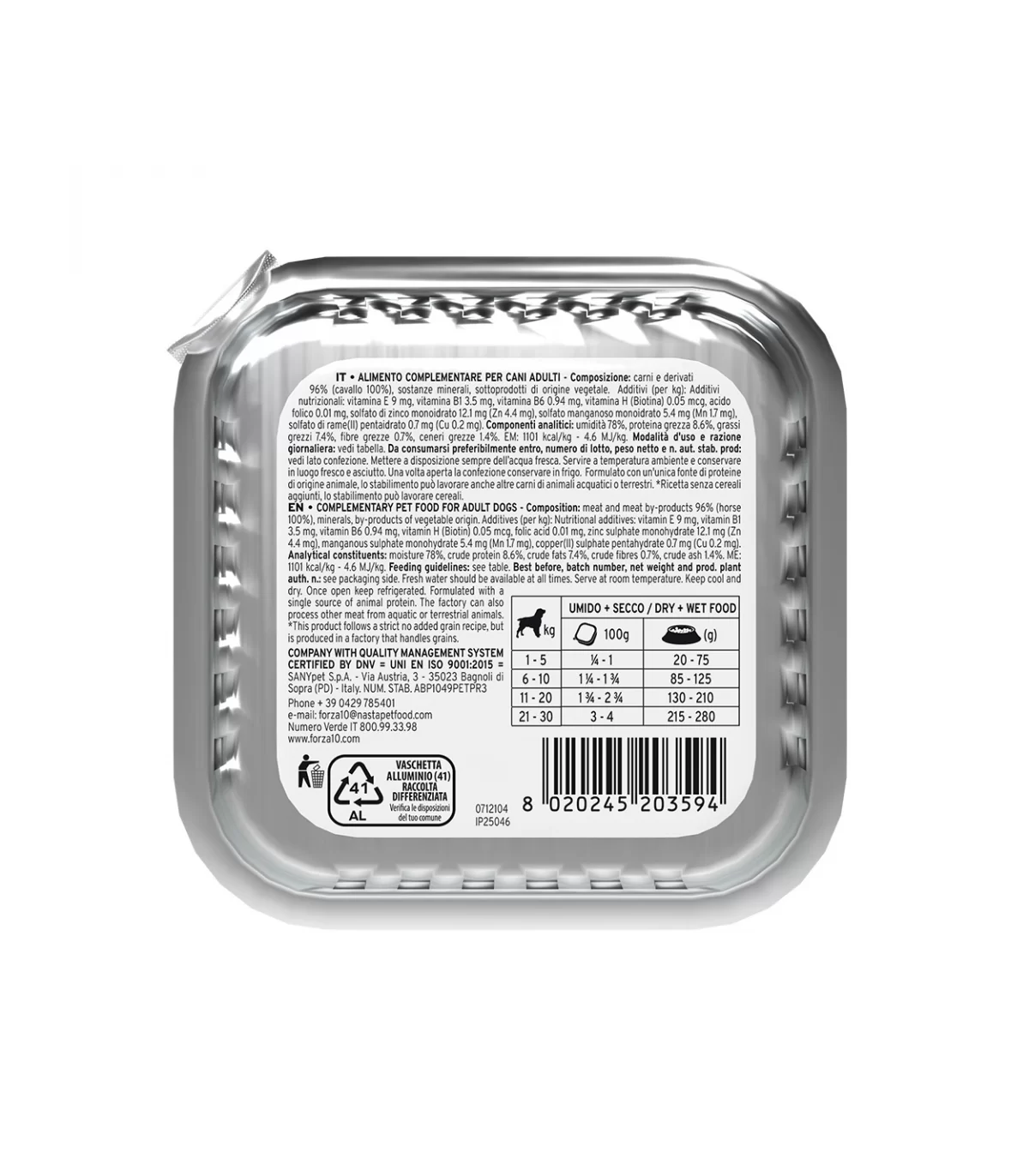 Composizione: carni e derivati 96% (cavallo 100%), sostanze minerali, sottoprodotti di origine vegetale (inulina da cicoria).