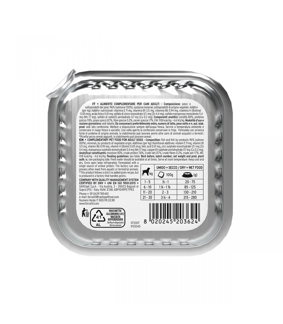 Composizione: pesci e sottoprodotti dei pesci 96% (salmone 100%), sostanze minerali, sottoprodotti di origine vegetale.