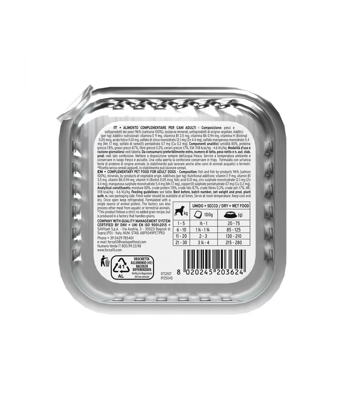 Composizione: pesci e sottoprodotti dei pesci 96% (salmone 100%), sostanze minerali, sottoprodotti di origine vegetale.