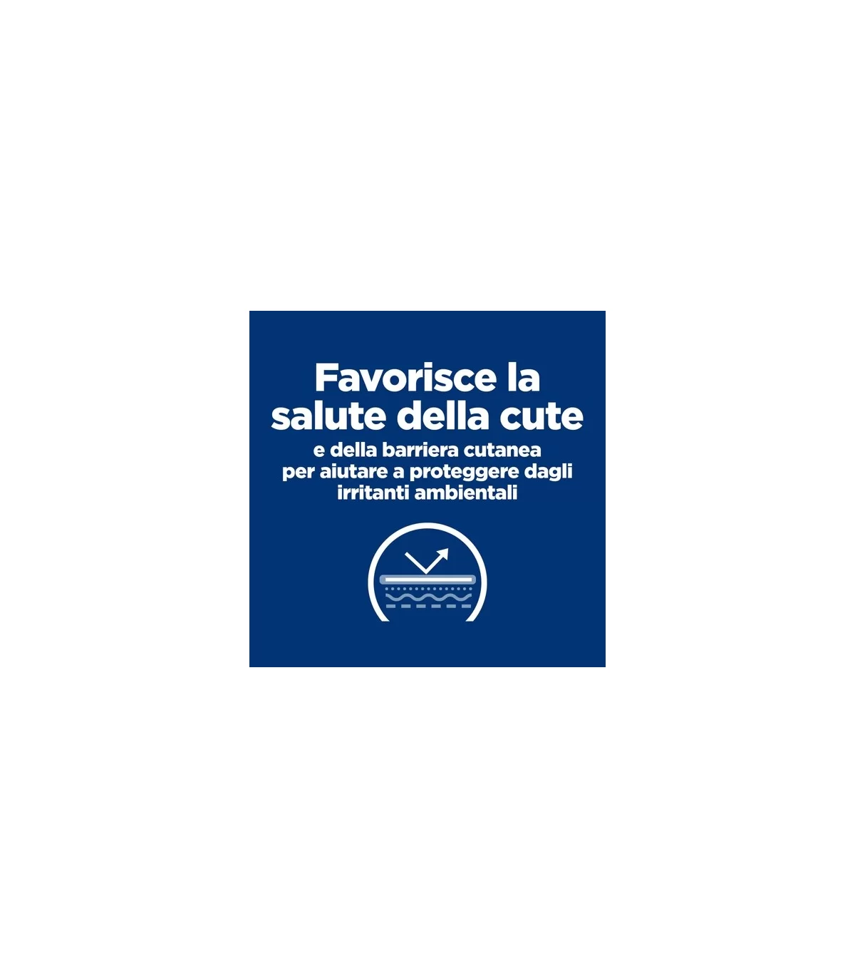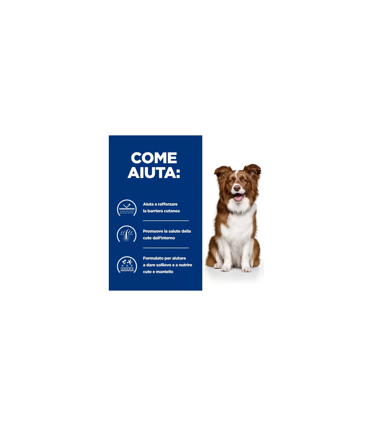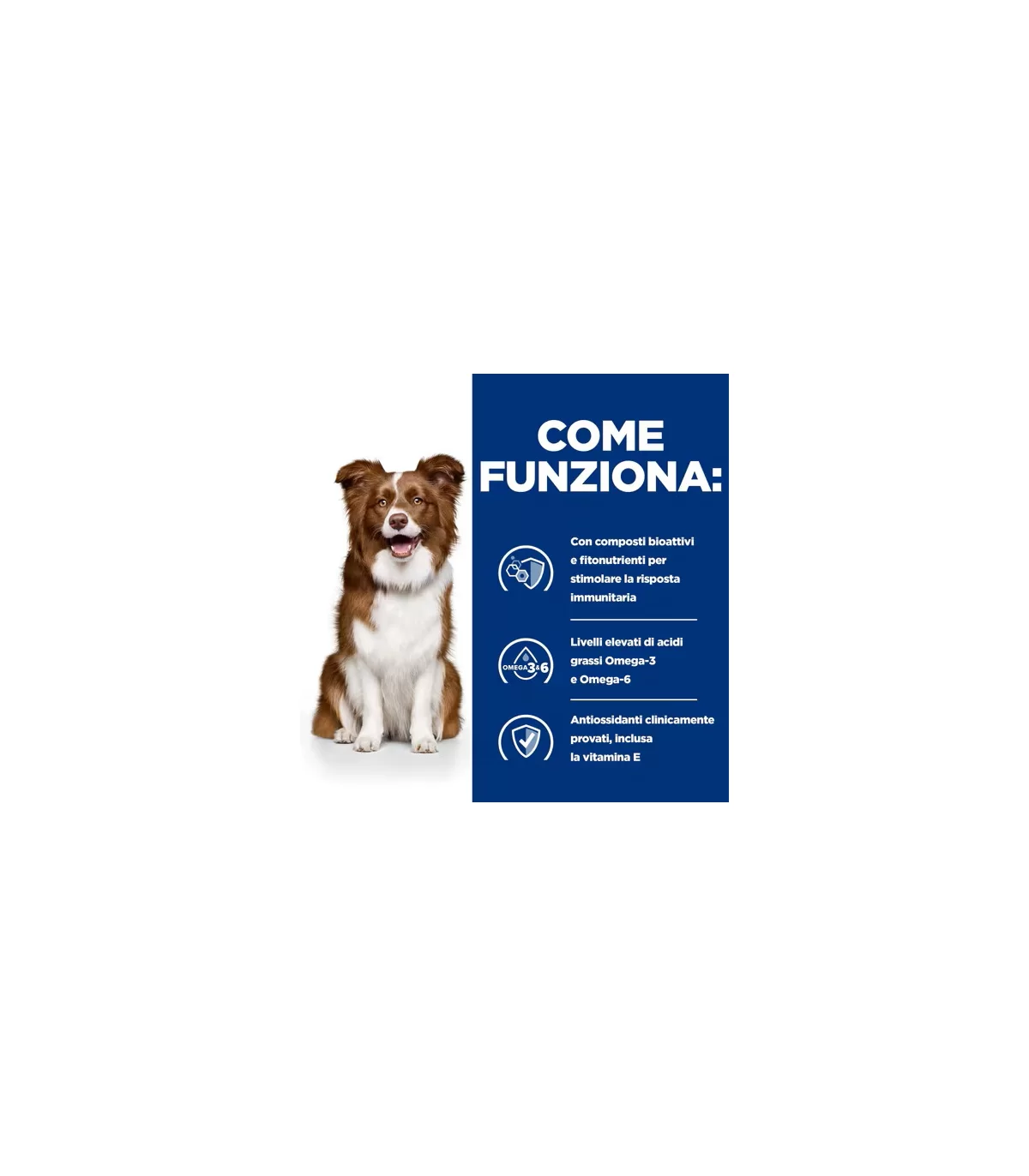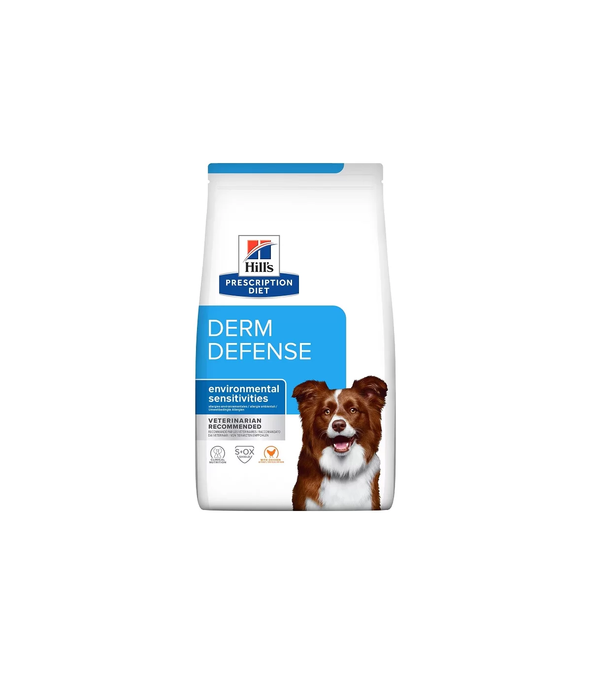 Hill's PRESCRITPION DIET Derm Defense alimento per cani con pollo è un alimento dietetico completo per il supporto della funzionalità cutanea in caso di dermatosi ed eccessiva perdita di pelo nei cani adulti. Questo alimento contiene elevati livelli di acido linoleico (LA) e della somma di acido eicosapentaenoico (EPA) e di acido docosaesaenoico (DHA).