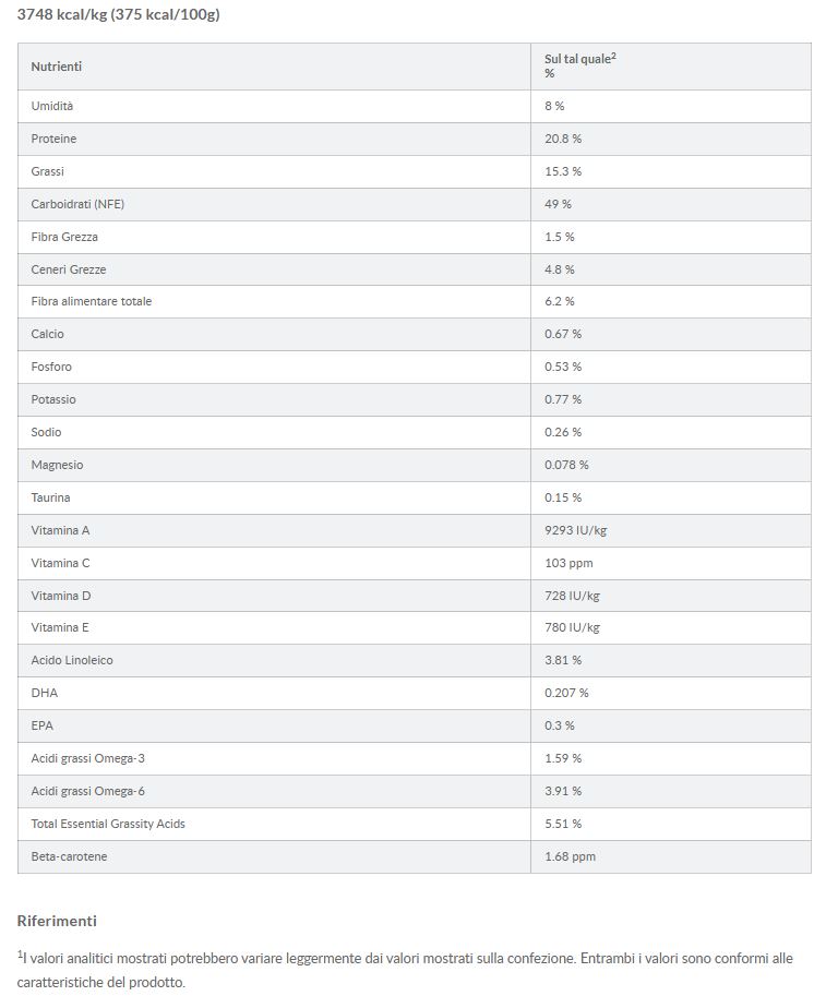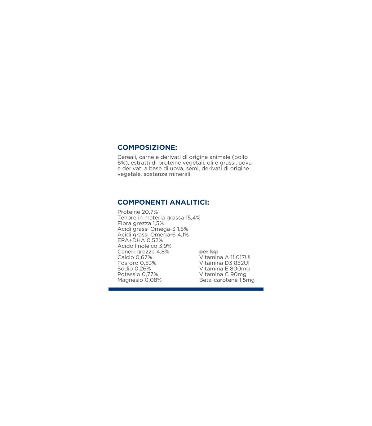 COMPONENTI ANALITICI: Proteine 20,8%, Tenore in materia grassa 15,3%, Fibra grezza 1,5%, Ceneri grezze 4,8%, Acidi grassi Omega-3 1,6%, Acidi grassi Omega-6 3,9%, EPA+DHA 0,51%, Acido linoleico 3,8%, Calcio 0,67%, Fosforo 0,53%, Sodio 0,26%, Potassio 0,77%, Magnesio 0,08%; per kg: Vitamina A 8.907UI, Vitamina D3 698UI, Vitamina E 748mg, Vitamina C 99mg, Beta-carotene 1,6mg.
