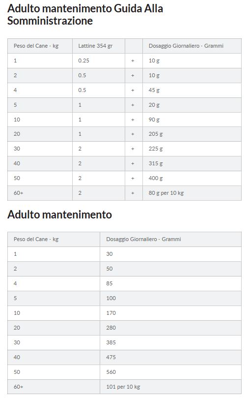 GUIDA ALLA SOMMINISTRAZIONE: Somministrare solo questo alimento. Si raccomanda di chiedere il parere di un veterinario prima dell’uso. Somministrare la corretta quantità giornaliera indicata in relazione al peso del cane. Eventualmente correggere la quantità in modo da mantenere il peso ottimale; la quantità può essere suddivisa in 2 o più pasti al giorno. Periodo di impiego raccomandato: inizialmente fino a 2 mesi. Lasciare acqua fresca sempre a disposizione.
