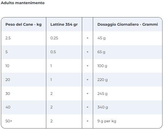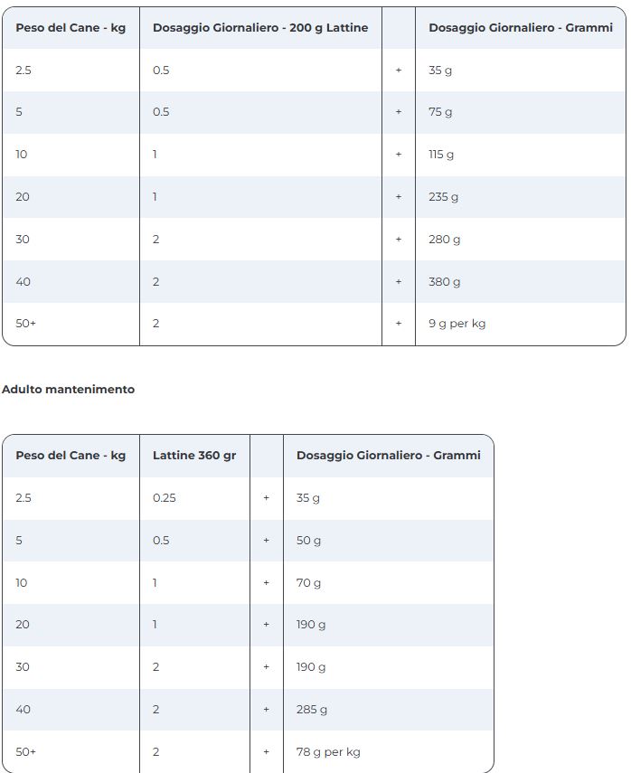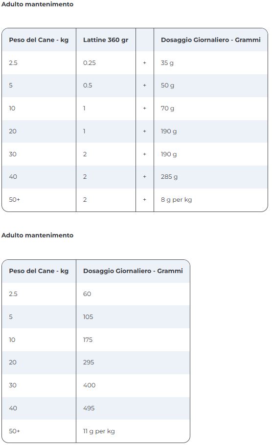 Chiedi al tuo veterinario le istruzioni specifiche per l'alimentazione del tuo animale.Le raccomandazioni per l'alimentazione giornaliera sono solo una guida e un punto di partenza.I grammi sono la forma di misurazione più accurata; i misurini sono stimati a partire dai grammi. Per ottenere risultati ottimali: