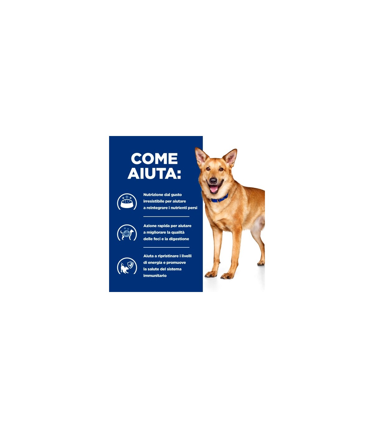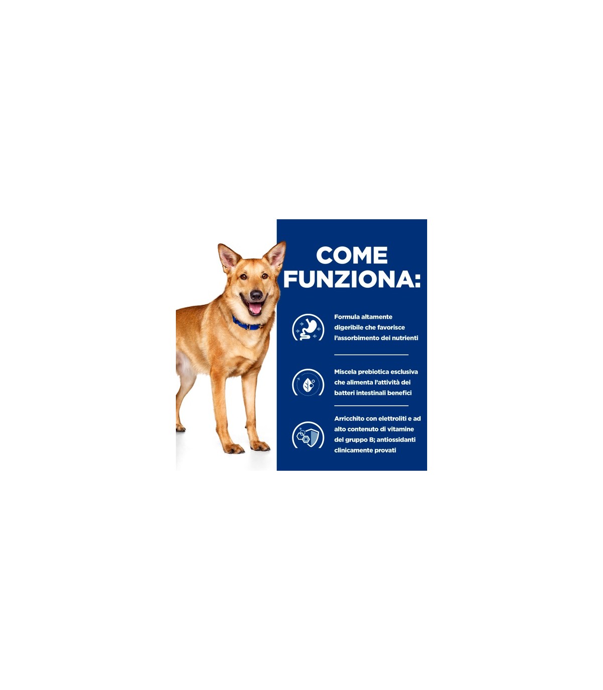 Nutrizione gustosa per reintegrare le sostanze nutritive perdute Agisce rapidamente per promuovere feci sane e contribuisce a migliorare la digestione Contribuisce a ripristinare i livelli di energia e promuove la salute del sistema immunitario
