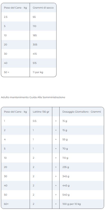 GUIDA ALLA SOMMINISTRAZIONE: Somministrare solo questo alimento. Si raccomanda di chiedere il parere di un veterinario prima dell’uso. Somministrare la corretta quantità giornaliera indicata secondo il peso del cane. Eventualmente correggere in modo da mantenere il peso ottimale; la quantità può essere divisa in 2 o più pasti al giorno. Periodo di impiego raccomandato: inizialmente fino a 12 settimane. Lasciare acqua fresca sempre a disposizione.