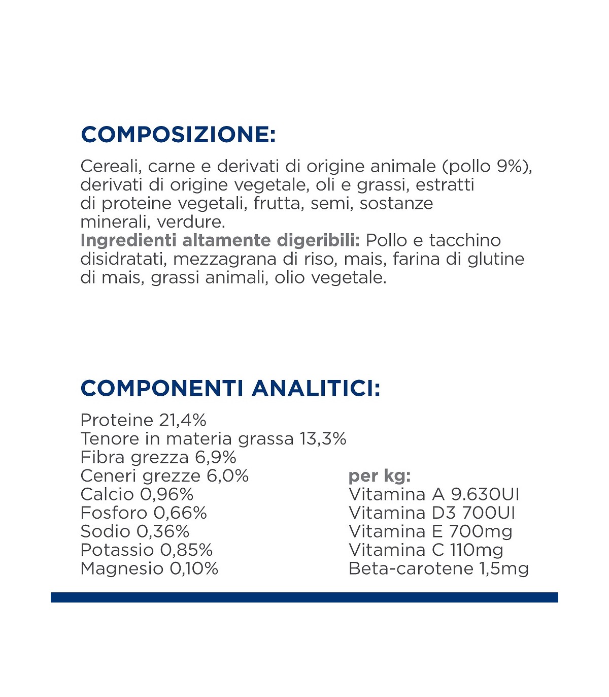 con pollo: Frumento, pollo (9%) e tacchino disidratati, mezzagrana di riso, mais, farina di glutine di mais, gusci di noci di pecan macinati, idrolisati, farina di crusca di piselli, grasso animale, orzo, avena, semi di lino, polpa di barbabietola disidratata, olio di soia, polpa di agrumi disidratata, minerali, olio di pesce, mirtilli disidratati, zucca disidratata, vitamine, zenzero disidratato, psyllium, elementi in tracce e beta-carotene. Con antiossidante naturale (tocoferoli misti).