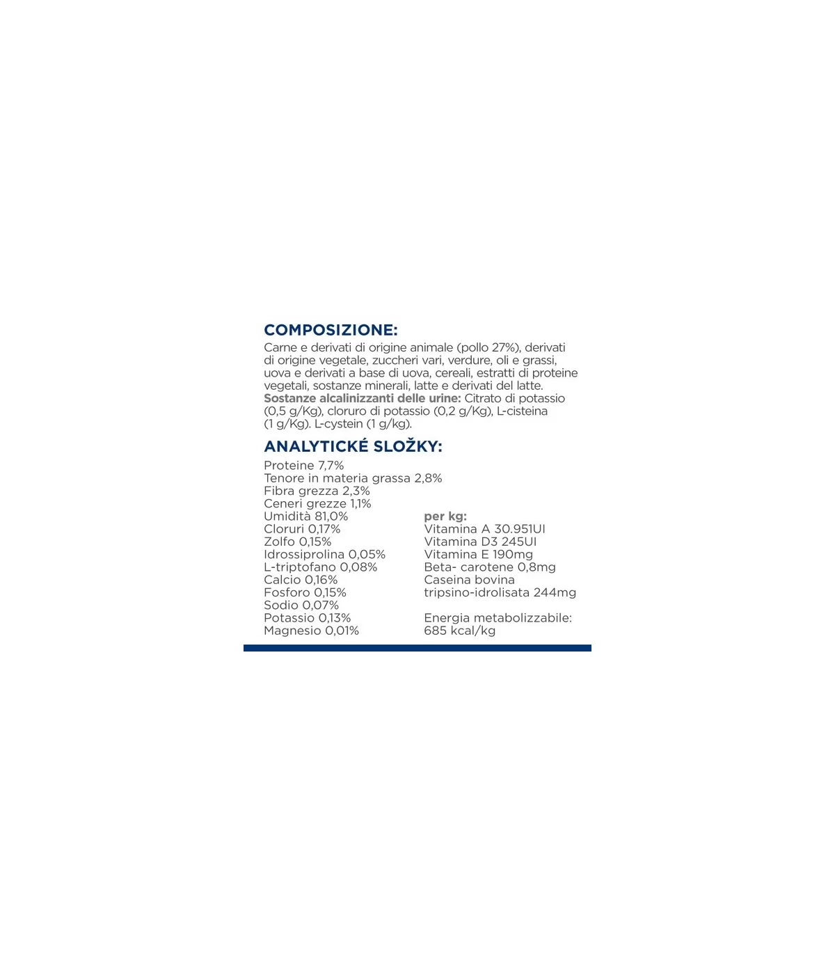 COMPOSIZIONE: Carne e derivati di origine animale (pollo 27%), derivati di origine vegetale, zuccheri vari, verdure, oli e grassi, uova e derivati dell'uovo, cereali, estratti proteici vegetali, minerali, latte e derivati del latte. Sostanze alcalinizzanti le urine: Citrato di potassio (0,5 g/kg), cloruro di potassio (0,2 g/kg), L-cisteina (1 g/kg).