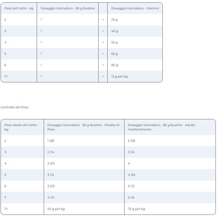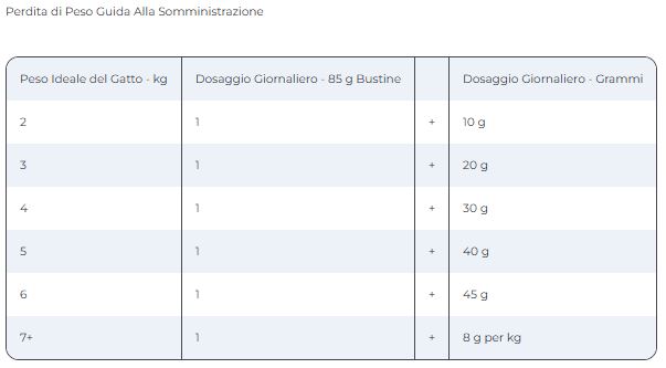 PER LA PERDITA DI PESO: determinare la quantità da somministrare in base al peso ideale e non rispetto al peso attuale. Per un gatto di 4 kg somministrare 2 1/2 bustine al giorno.