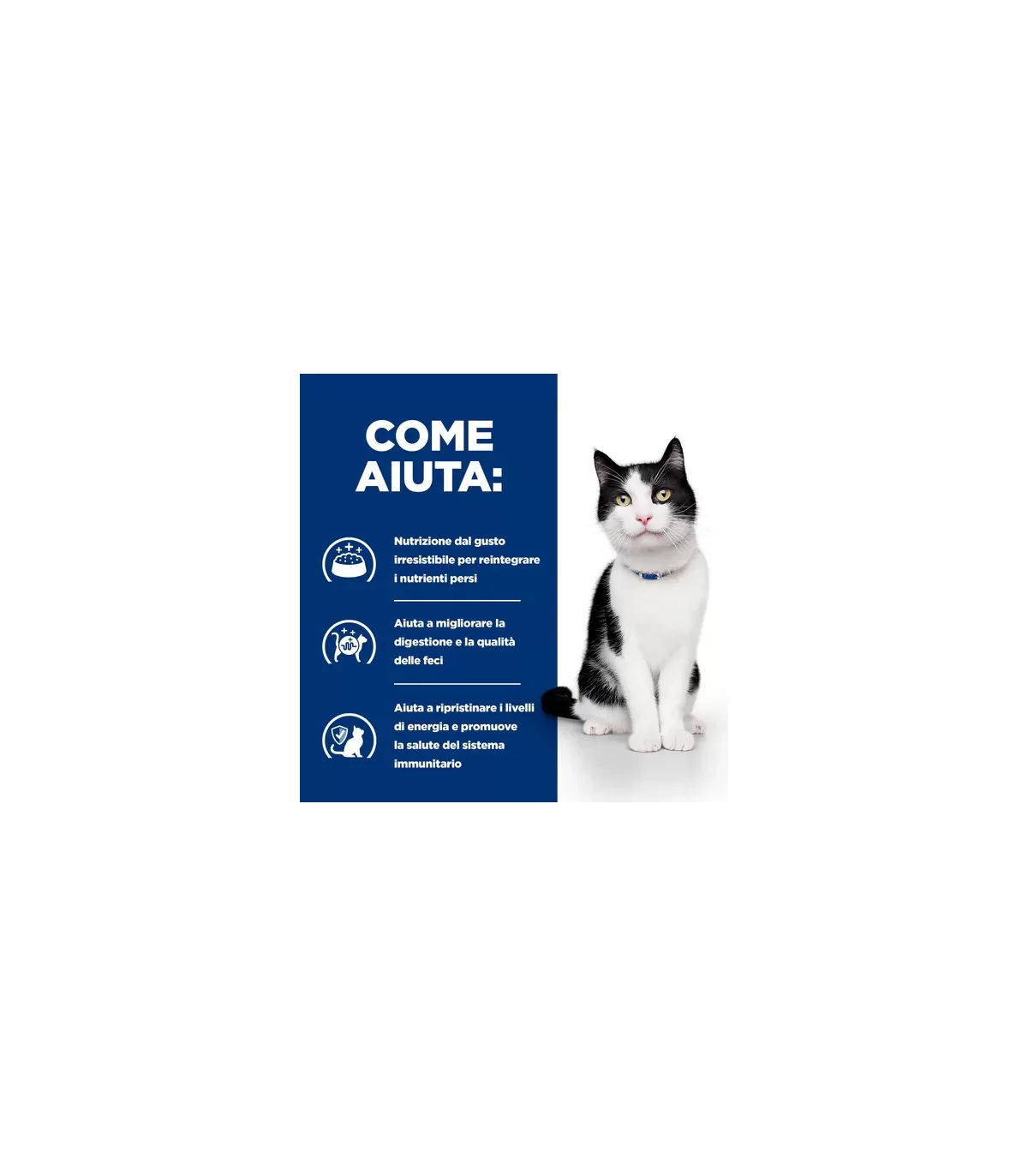 Hill’s Prescription Diet i/d alimento secco per gatti è un alimento altamente digeribile, formulato appositamente per aiutare a ridurre i disturbi digestivi e assicurare il facile assorbimento dei nutrienti. Questo alimento, ricco di vitamine del gruppo B e con l’aggiunta di elettroliti, aiuta a reintegrare i nutrienti persi. Formulato con ActivBiome+ Digestion, una miscela di fibre prebiotiche proprietaria di Hill’s, che ha dimostrato clinicamente di nutrire rapidamente il microbioma intestinale per favorire una qualità ottimale delle feci e la salute dell’apparato digerente. Contiene omega-3, omega-6 e antiossidanti clinicamente testati, per favorire la salute del sistema immunitario. Hill’s Prescription Diet i/d alimento secco per gatti soddisfa le speciali esigenze nutrizionali dei gatti adulti ed è realizzato con pollo, per un gusto irresistibile che il tuo gatto adorerà.