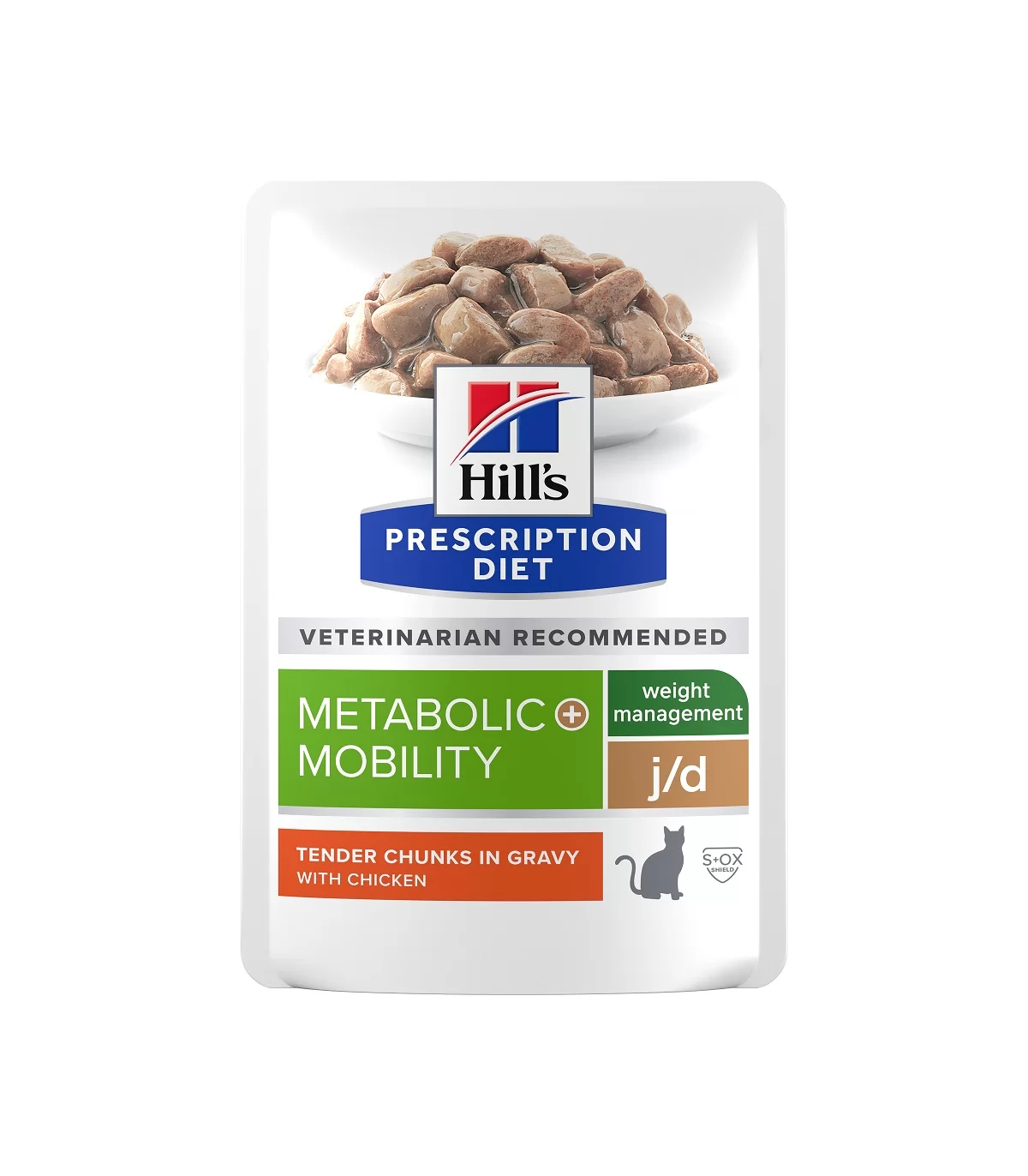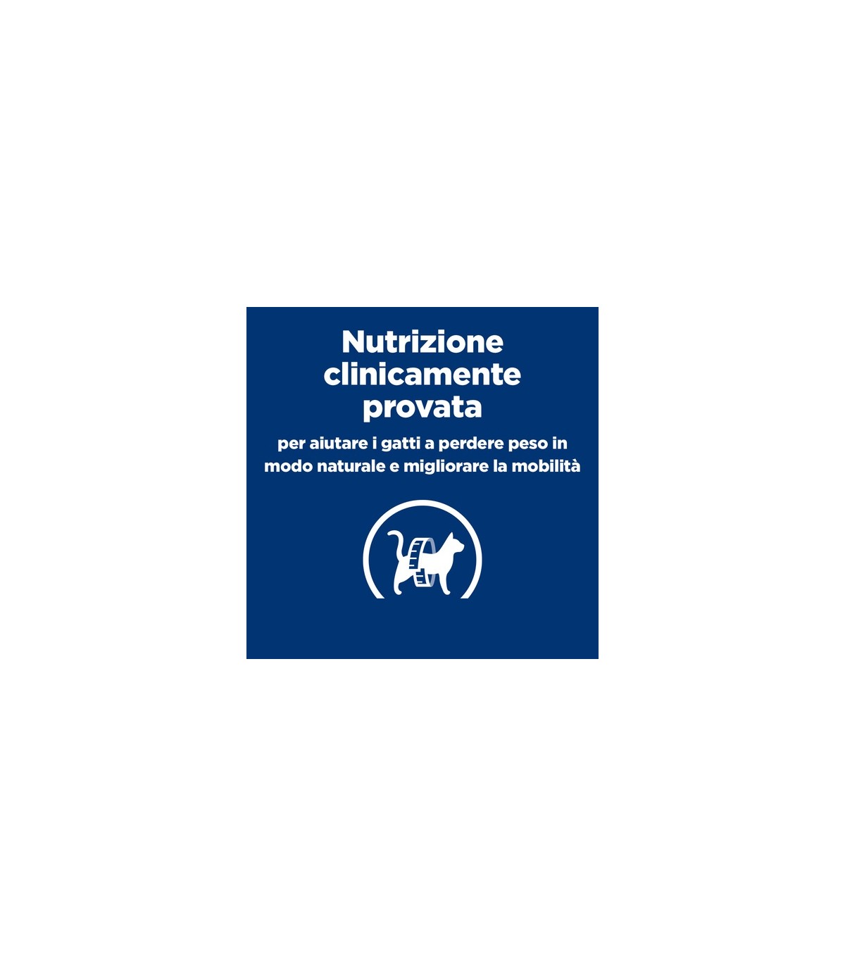 Oltre il 60% della popolazione felina è in sovrappeso. Anche un po' di peso in eccesso può influire sulla qualità della vita di un animale e sul suo rapporto con la famiglia, in quanto, il peso aggiuntivo può ridurre il tempo di attività e influire sulla mobilità e sulla salute generale dei gatti per tutta la loro vita. Mantenere un peso ideale può contribuire a influenzare l’aspettativa di vita, riducendo il rischio di patologie legate al peso. Inoltre, il peso extra può spesso causare problemi di mobilità, che a loro volta possono essere dolorosi per i gatti. I nutrizionisti e i veterinari Hill’s hanno sviluppato Hill’s Prescription Diet Metabolic + Mobility Alimento Umido per Gatti con Pollo. È una nutrizione clinicamente testata per aiutare i gatti a perdere peso in modo naturale. Inoltre, contiene sostanze nutritive che aiutano a preservare la cartilagine e a migliorare la mobilità. Questo alimento stimola la naturale capacità dei gatti di bruciare i grassi e li mantiene giocosi e attivi. La sua esclusiva miscela di fibre aiuta i gatti a sentirsi sazi e a ridurre la fame tra i pasti. Infatti, l’88% degli animali domestici ha perso peso a casa in 2 mesi, nutriti con nutrizione Metabolic. Questo alimento umido al gusto di pollo ha un sapore a cui il tuo gatto non potrà resistere.