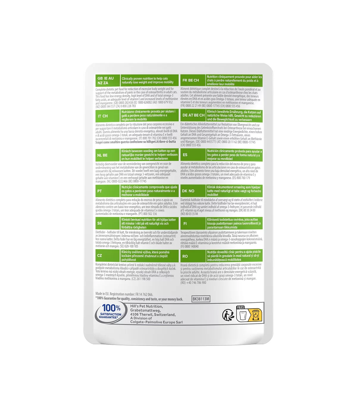 Hill's PRESCRIPTION DIET Metabolic + Mobility Alimento per Gatti con Pollo è un alimento dietetico completo per la riduzione del peso corporeo in eccesso nonché per il metabolismo delle articolazioni in caso di osteoartrite nei gatti adulti. Questo alimento ha una bassa densità energetica, un alto livello di DHA e di acidi grassi omega-3 totali, un livello adeguato di vitamina E e livelli aumentati di metionina e manganese.