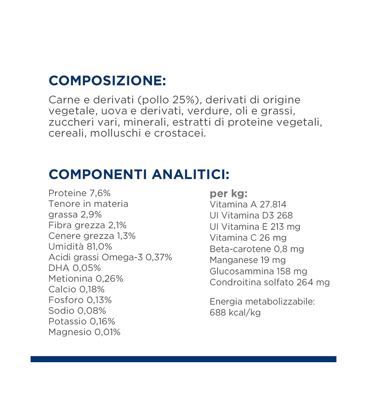 COMPOSIZIONE: Carne e derivati di origine animale (pollo 25%), derivati di origine vegetale, uova e derivati a base di uova, verdure, oli e grassi, zuccheri vari, sostanze minerali, estratti di proteine vegetali, cereali, molluschi e crostacei.