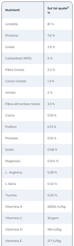 ¹I valori analitici mostrati potrebbero variare leggermente dai valori mostrati sulla confezione. Entrambi i valori sono conformi alle caratteristiche del prodotto.
