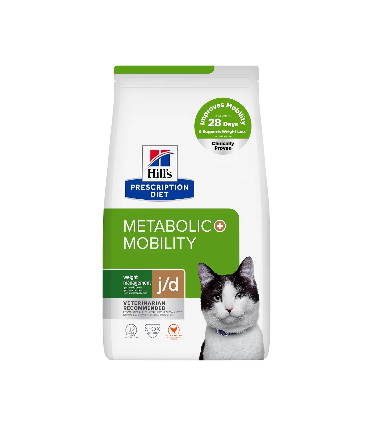 Hill's PRESCRIPTION DIET Metabolic + Mobility Alimento per Gatti con Pollo è un alimento dietetico completo per la regolazione dei livelli glicemici (diabete mellito) nonché per il metabolismo delle articolazioni in caso di osteoartrite nei gatti adulti. Questo alimento contiene un basso livello di mono- e disaccaridi, un alto livello di DHA e di acidi grassi omega-3 totali, un livello adeguato di vitamina E e livelli aumentati di metionina e manganese.