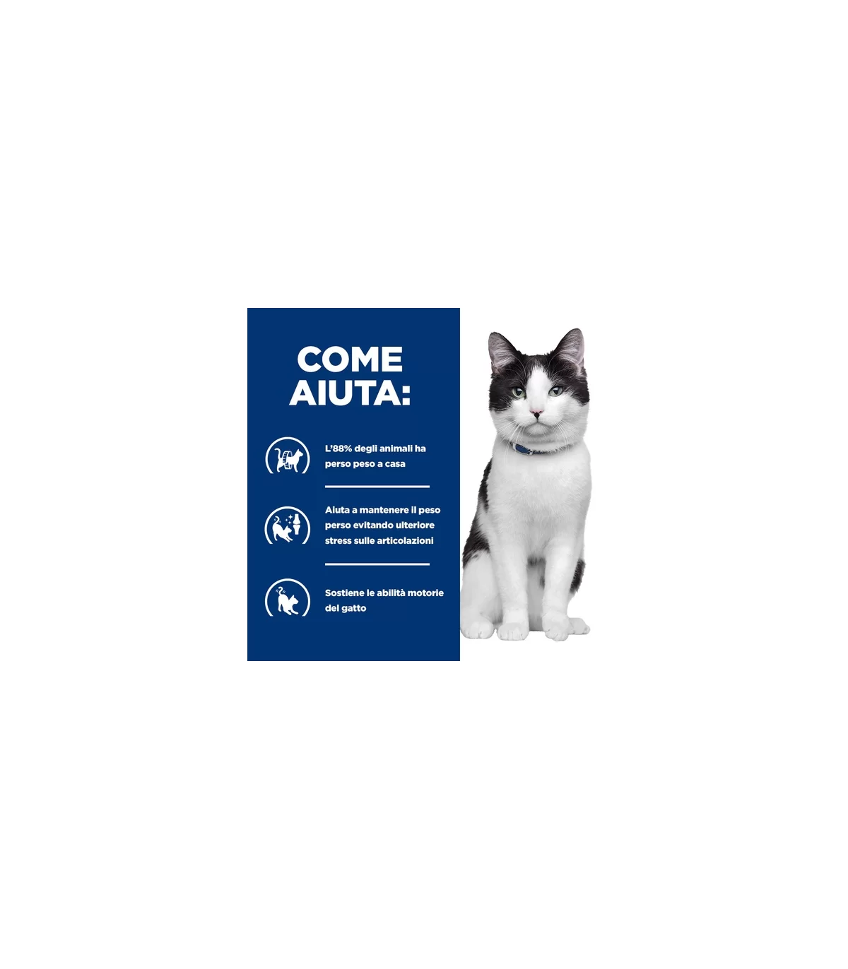 L'88% dei pet ha perso peso a casaAiuta la capacità del tuo gatto di correre, camminare e saltareAiuta a non riprendere il peso perduto ed evita un ulteriore stress alle articolazioni
