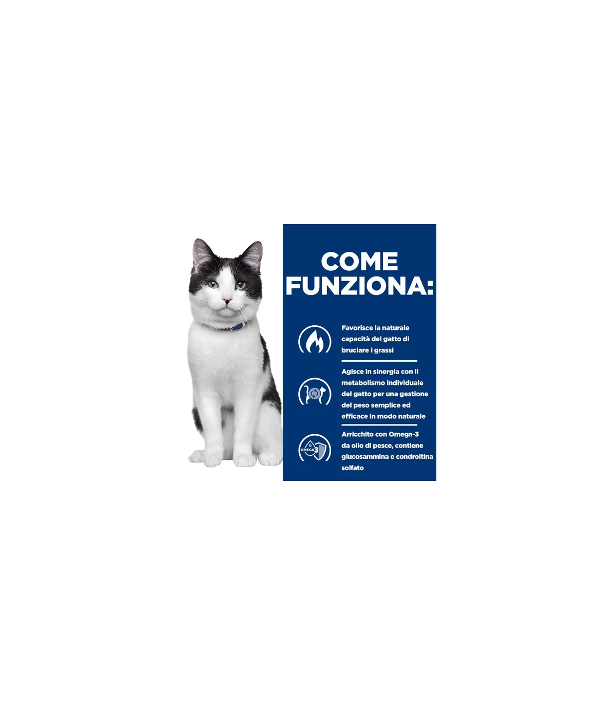 Favorisce la naturale abilità del gatto a bruciare i grassi. Agisce in modo naturale sull'utilizzo dell'energia da parte del gatto, per una gestione del peso facile ed efficaceArricchito con omega-3 provenienti dall'olio di pesce e con glucosamina e condroitina solfato