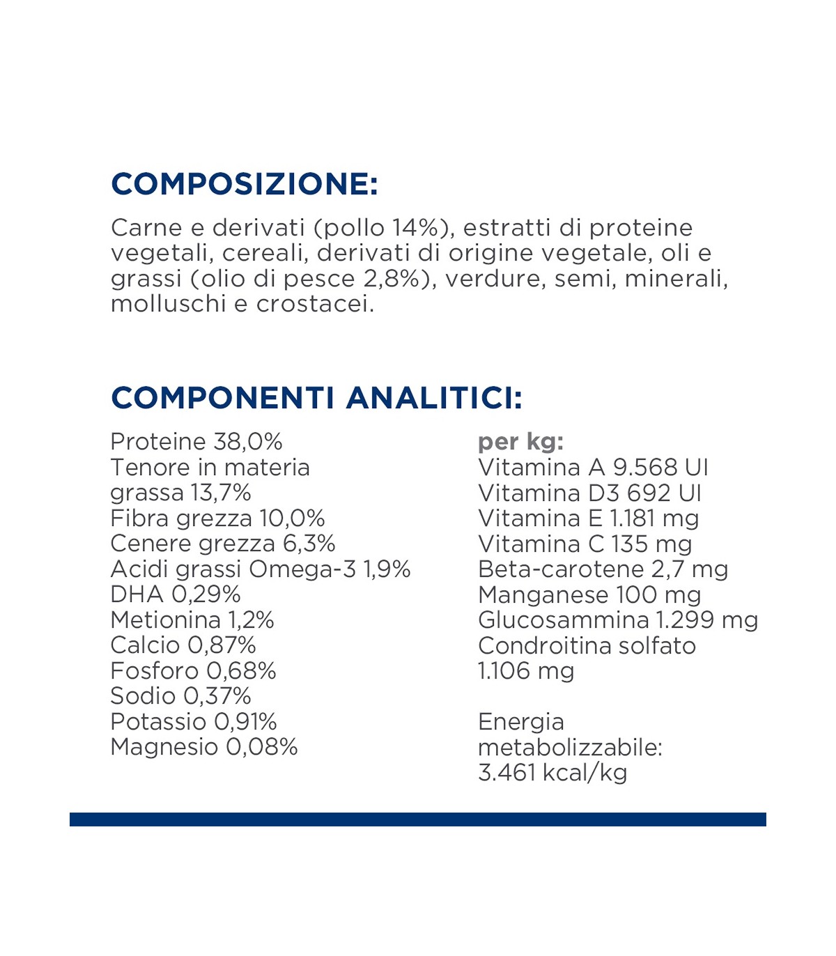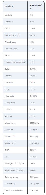 COMPOSIZIONE: Carne e derivati di origine animale (pollo 14%), estratti di proteine vegetali, cereali, derivati di origine vegetale, oli e grassi (olio di pesce 2,8%), verdure, semi, sostanze minerali, molluschi e crostacei. Fonte di carboidrati: Mezzagrana di riso.