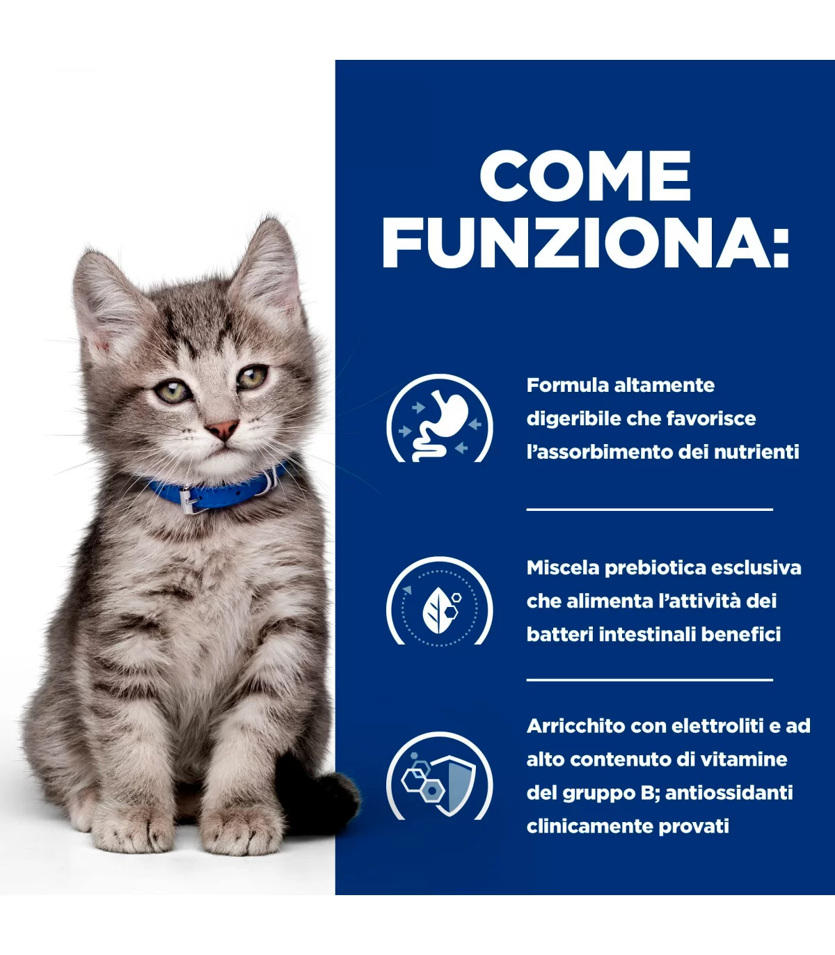 Hill’s Prescription Diet i/d alimento secco per gattini con pollo è un alimento dal gusto eccezionale, formulato per aiutare a ridurre i disturbi digestivi. Questo alimento altamente digeribile, con aggiunta di elettroliti e un elevato contenuto di vitamine del gruppo B, garantisce un facile assorbimento dei nutrienti e reintegra le sostanze nutritive perse. Contiene ActivBiome+ Digestion, una miscela di fibre prebiotiche proprietaria di Hill’s, che ha dimostrato clinicamente di nutrire rapidamente il microbioma intestinale per favorire una qualità ottimale delle feci e la salute dell’apparato digerente. Contiene omega-3, omega-6 e antiossidanti clinicamente testati, per favorire la salute del sistema immunitario. Hill's Prescription Diet i/d alimento secco per gattini è formulato appositamente per aiutare a ridurre i disturbi digestivi e soddisfare le speciali esigenze nutrizionali dei gattini.
