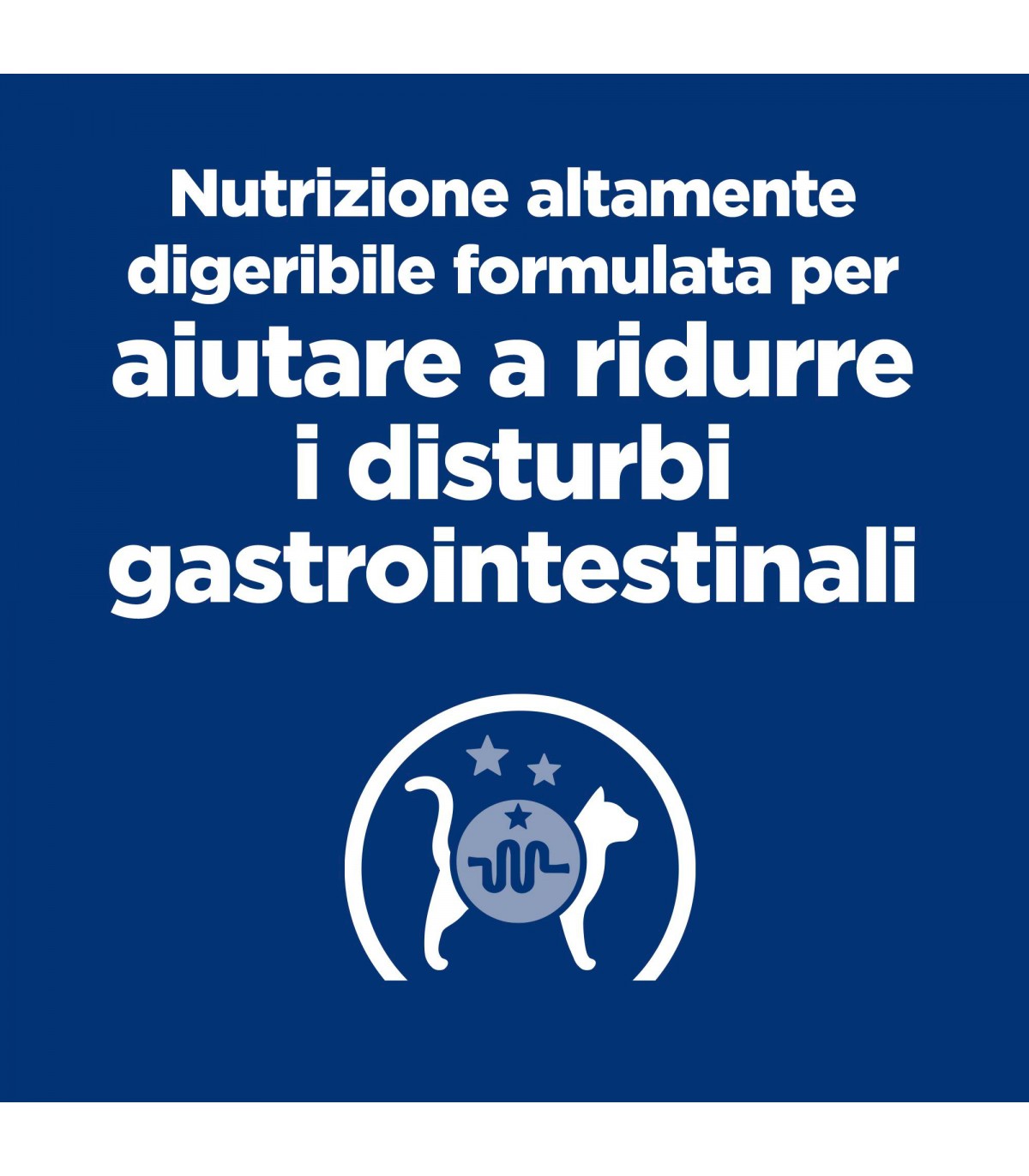 Hill's PRESCRIPTION DIET i/d Kitten alimento con pollo è un alimento dietetico completo altamente digeribile per la riduzione dei disordini di assorbimento intestinale, per la compensazione della maldigestione e per l'insufficienza pancreatica esocrina nei gattini. Questo alimento contiene livelli incrementali di sodio e potassio ed ingredienti altamente digeribili.