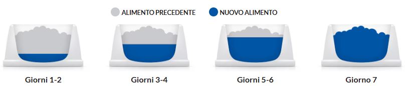 Nuovo alimento? Mescolare quantità crescenti del nuovo alimento a quantità decrescenti del precedente alimento, fino a completa sostituzione nell'arco di 7 giorni.