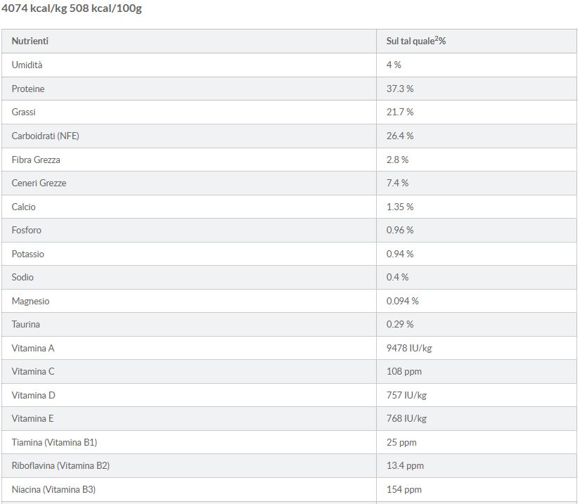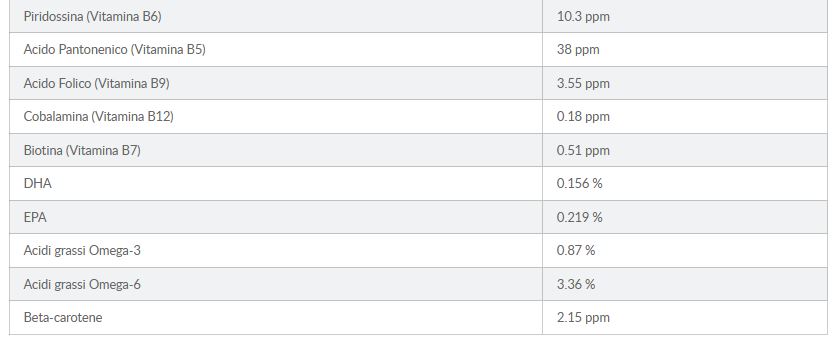 COMPONENTI ANALITICI: Proteine 37,3%, Tenore in materia grassa 21,7%, Fibra grezza 2,8%, Ceneri grezze 7,4%, Calcio 1,4%, Fosforo 0,96%, Sodio 0,40%, Potassio 0,94%, Magnesio 0,09%; per kg: Vitamina A 9.478 UI, Vitamina D3 757 UI, Vitamina E 768 mg, Vitamina C 108 mg, Beta-carotene 2,2 mg, Vitamina B1 24,7 mg, Vitamina B12 0,18 mg.