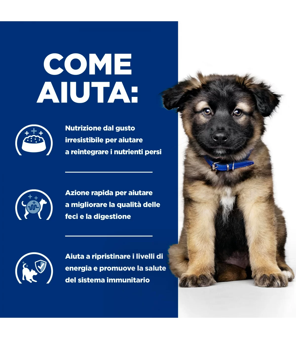Hill’s Prescription Diet i/d alimento secco per cuccioli con pollo è un alimento dal gusto eccezionale, formulato per aiutare a ridurre i disturbi digestivi. Questo alimento altamente digeribile, con aggiunta di elettroliti e un elevato contenuto di vitamine del gruppo B, garantisce un facile assorbimento dei nutrienti e reintegra le sostanze nutritive perse. Formulato con ActivBiome+ Digestion, una speciale miscela di fibre prebiotiche proprietaria di Hill’s, che ha dimostrato clinicamente di nutrire rapidamente il microbioma intestinale per favorire una qualità ottimale delle feci e la salute dell’apparato digerente. Contiene omega-3, omega-6 e antiossidanti clinicamente testati, per favorire la salute del sistema immunitario. Hill’s Prescription Diet i/d alimento secco per cuccioli è formulato appositamente per aiutare a ridurre i disturbi digestivi e per soddisfare le speciali esigenze nutrizionali dei cuccioli.