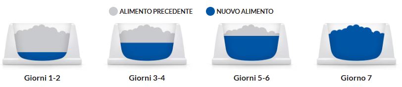 Nuovo alimento? Mescolare quantità crescenti del nuovo alimento a quantità decrescenti del precedente alimento, fino a completa sostituzione nell'arco di 7 giorni.